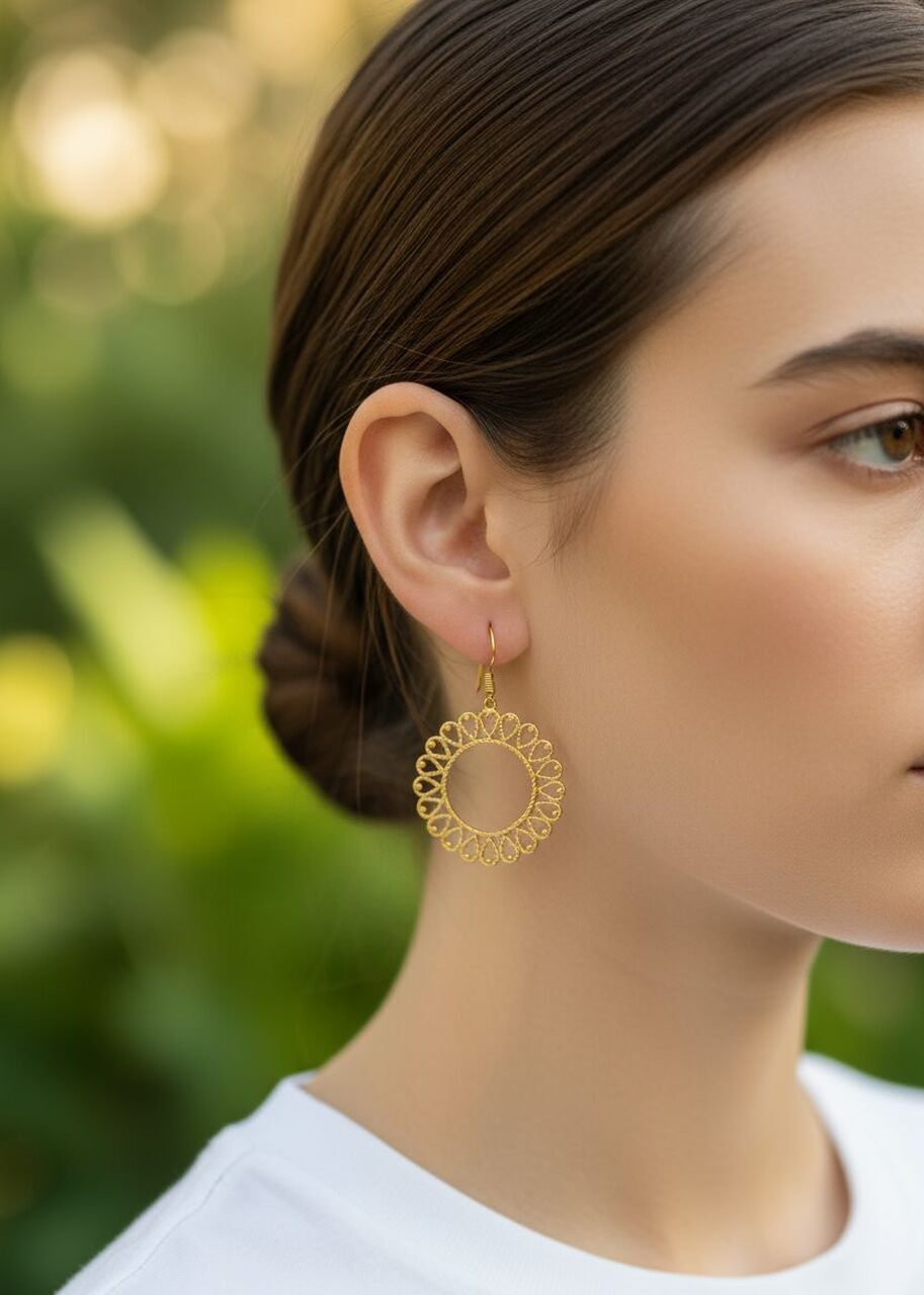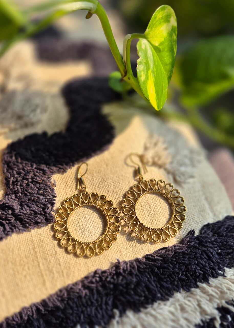 Kolczyki z mosiądzu wykonane w Indiach to unikalny dodatek o lekko surowym, lecz eleganckim charakterze. Ręczne wykonanie nadaje im niepowtarzalne detale i naturalny, ciepły połysk metalu. Dzięki wysokiej trwałości mosiądz dobrze sprawdza się na co dzień oraz na okazje wieczorowe. Lekka waga i wygodny haczyk zapewniają komfort noszenia przez długi czas. Produkt łączy tradycyjne rzemiosło z nowoczesnym designem, świetnie komponując się z różnorodnymi stylizacjami.