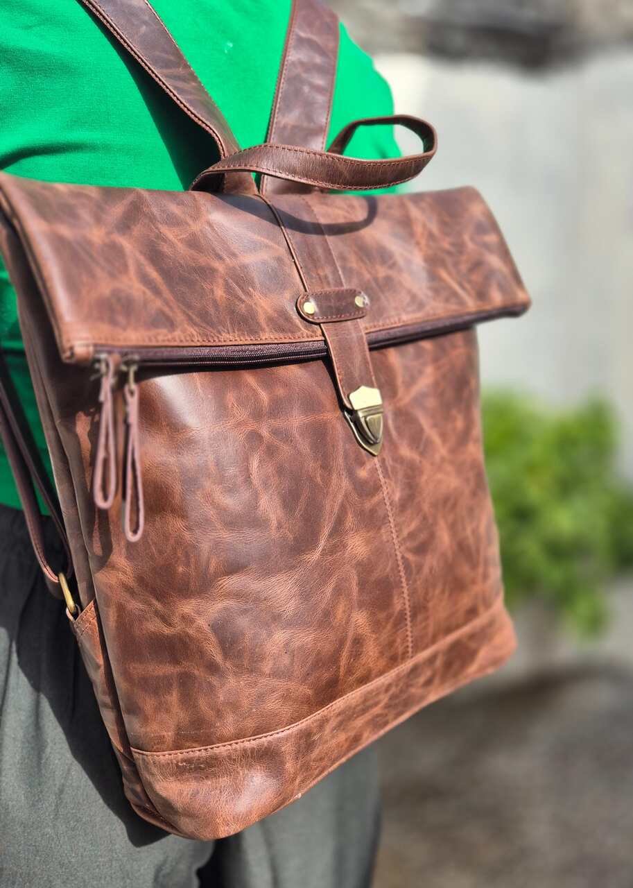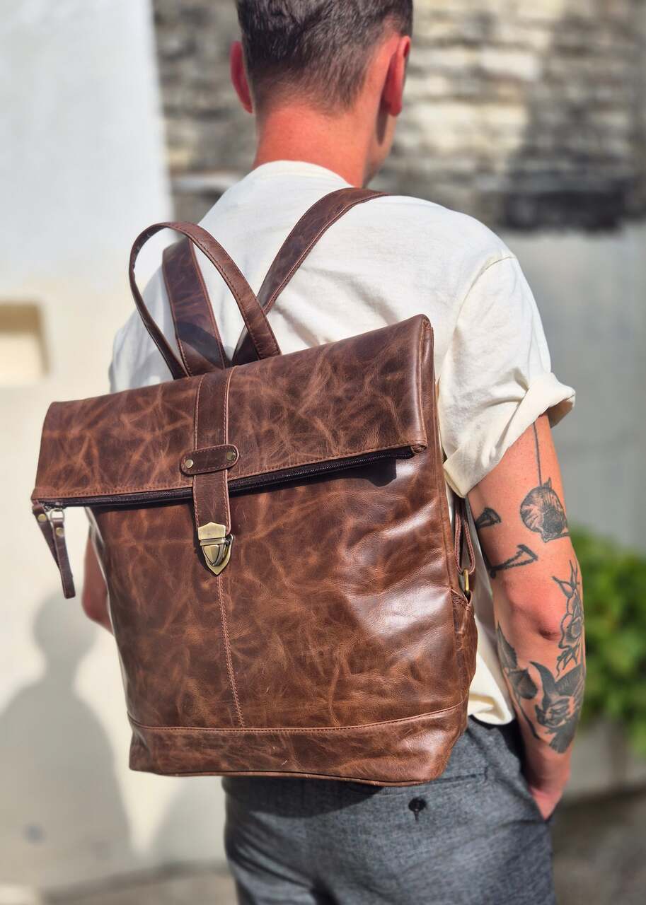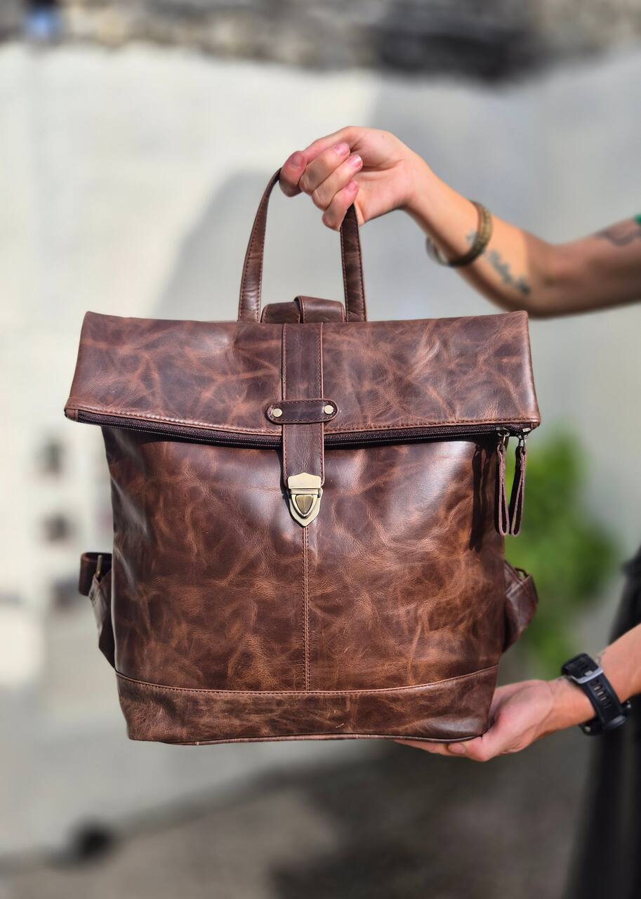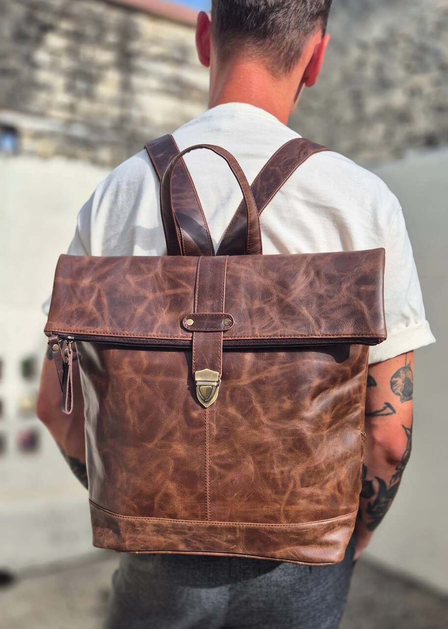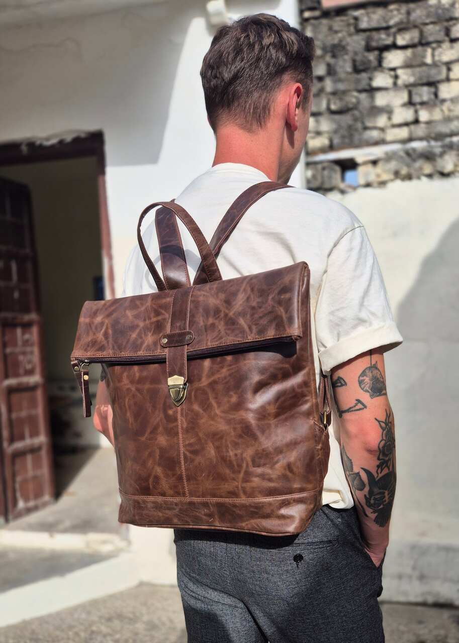 Ręcznie wykonany plecak ze skóry naturalnej, stworzony w Indiach. Plecak wykonany jest ze starannie wyselekcjonowanych materiałów, które gwarantują trwałość i naturalny charakter skóry. Konstrukcja plecaka jest zwijana, co nadaje mu minimalistyczny, ale funkcjonalny wygląd i możliwość regulacji objętości. Wykończenia są precyzyjne, a szwy mocne, co zapewnia długą żywotność nawet przy codziennym użytkowaniu. Naturalne odcienie skóry podkreślają autentyczność produktu i każdy egzemplarz ma unikalną fakturę skóry. Plecak łączy tradycyjne rzemiosło z praktycznością, idealny do miejskiego stylu życia oraz podróży. Dzięki kompaktowej formie, po złożeniu zajmuje niewiele miejsca, a po rozłożeniu zyskuje pełną pojemność na codzienne rzeczy.