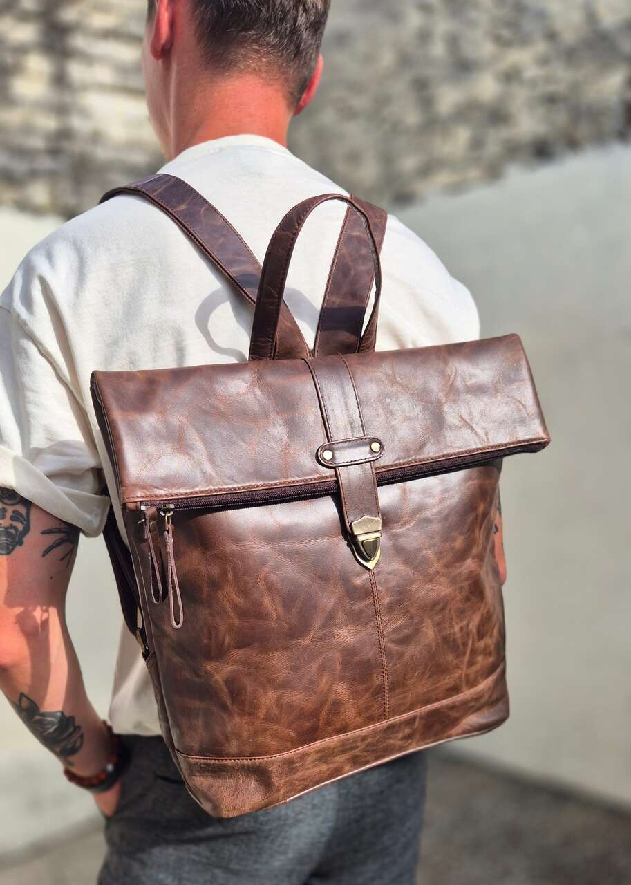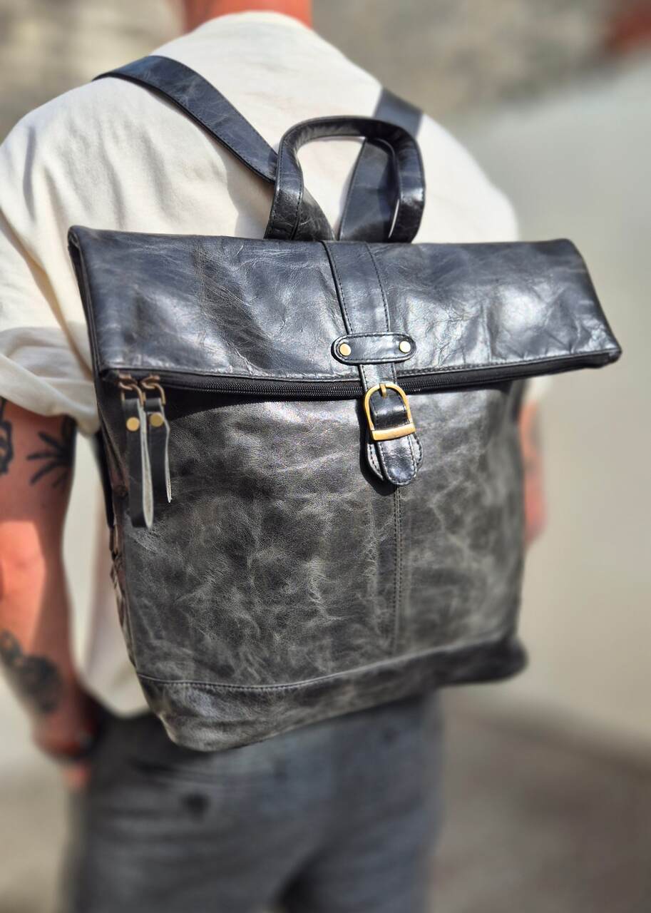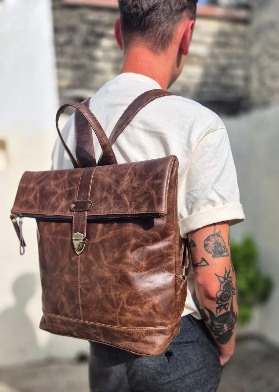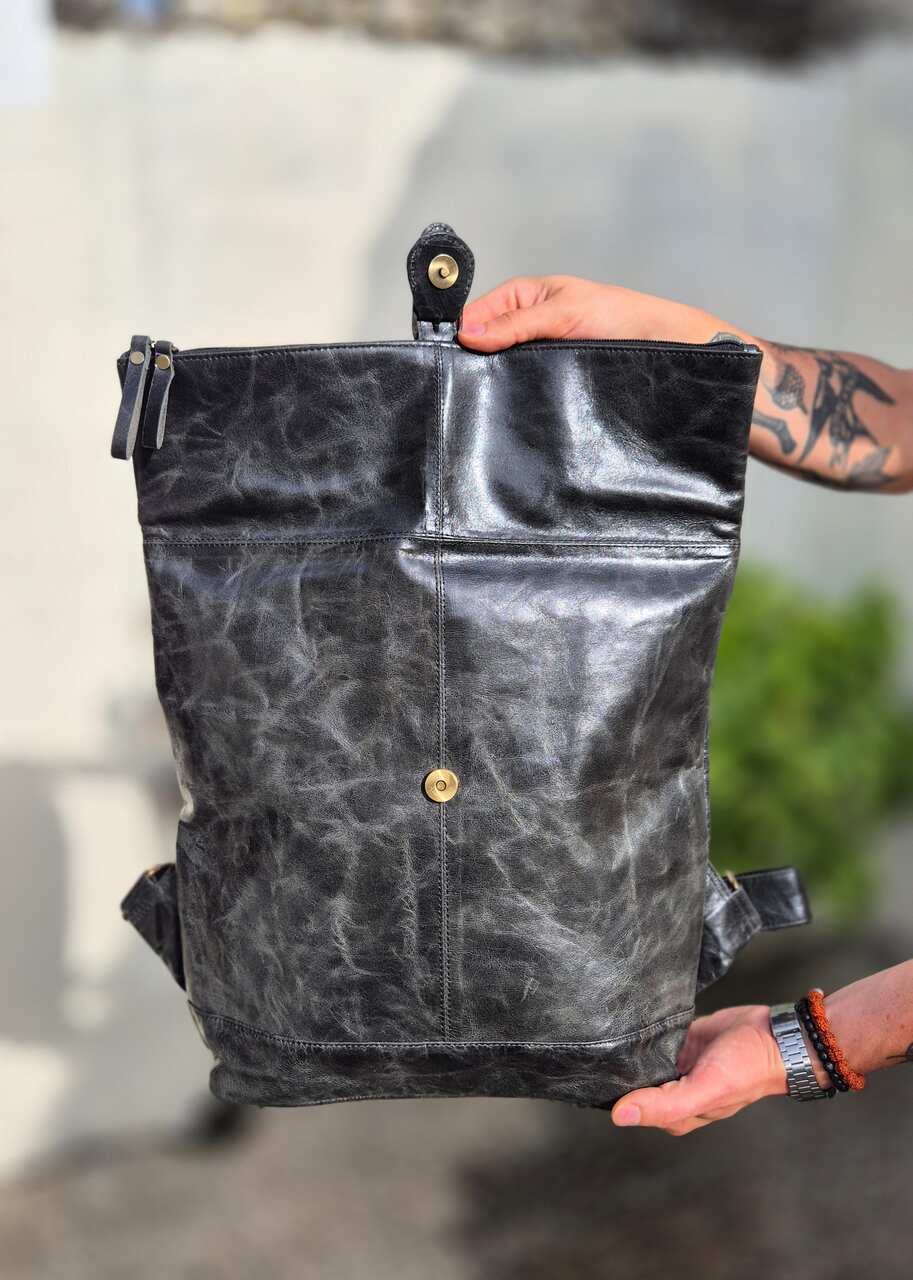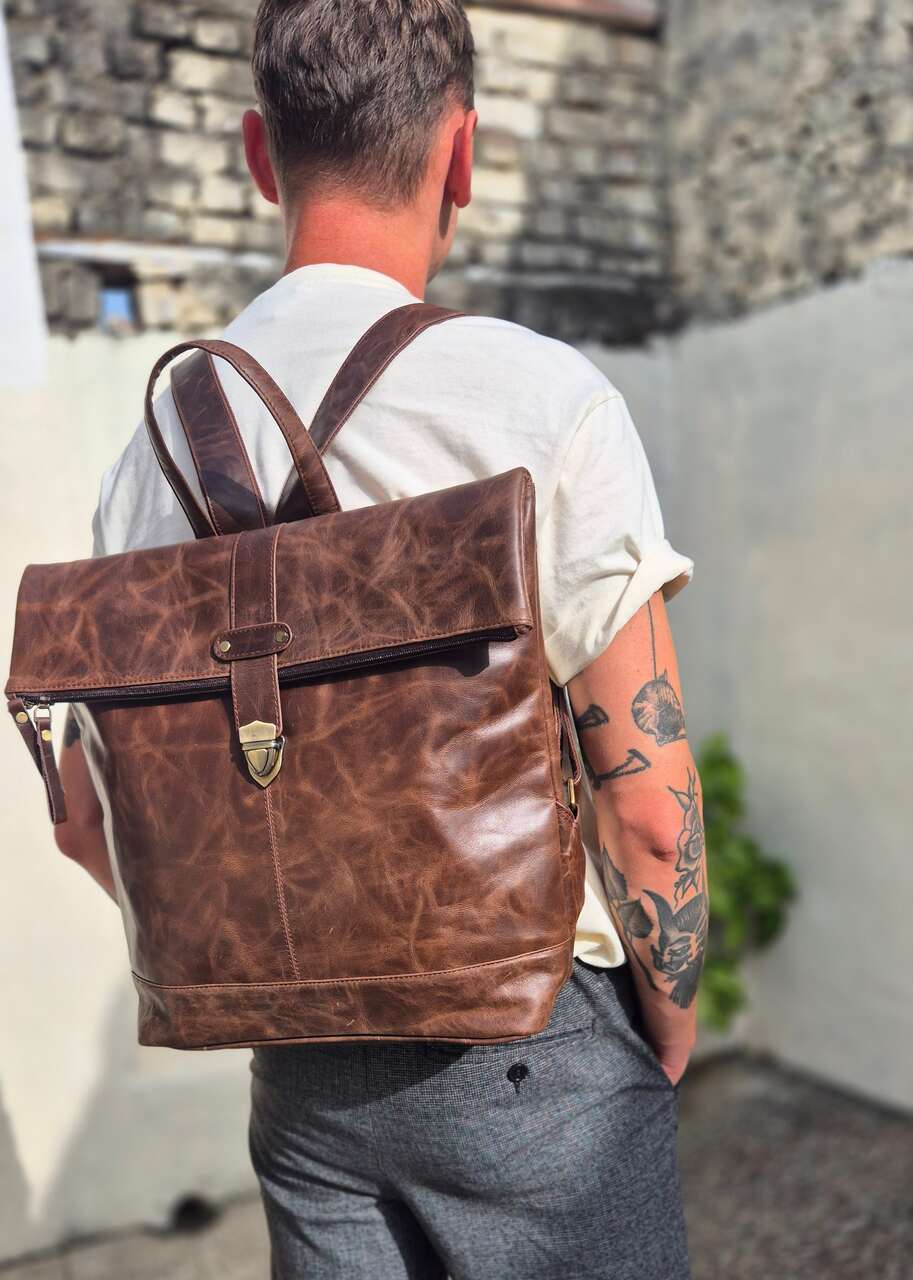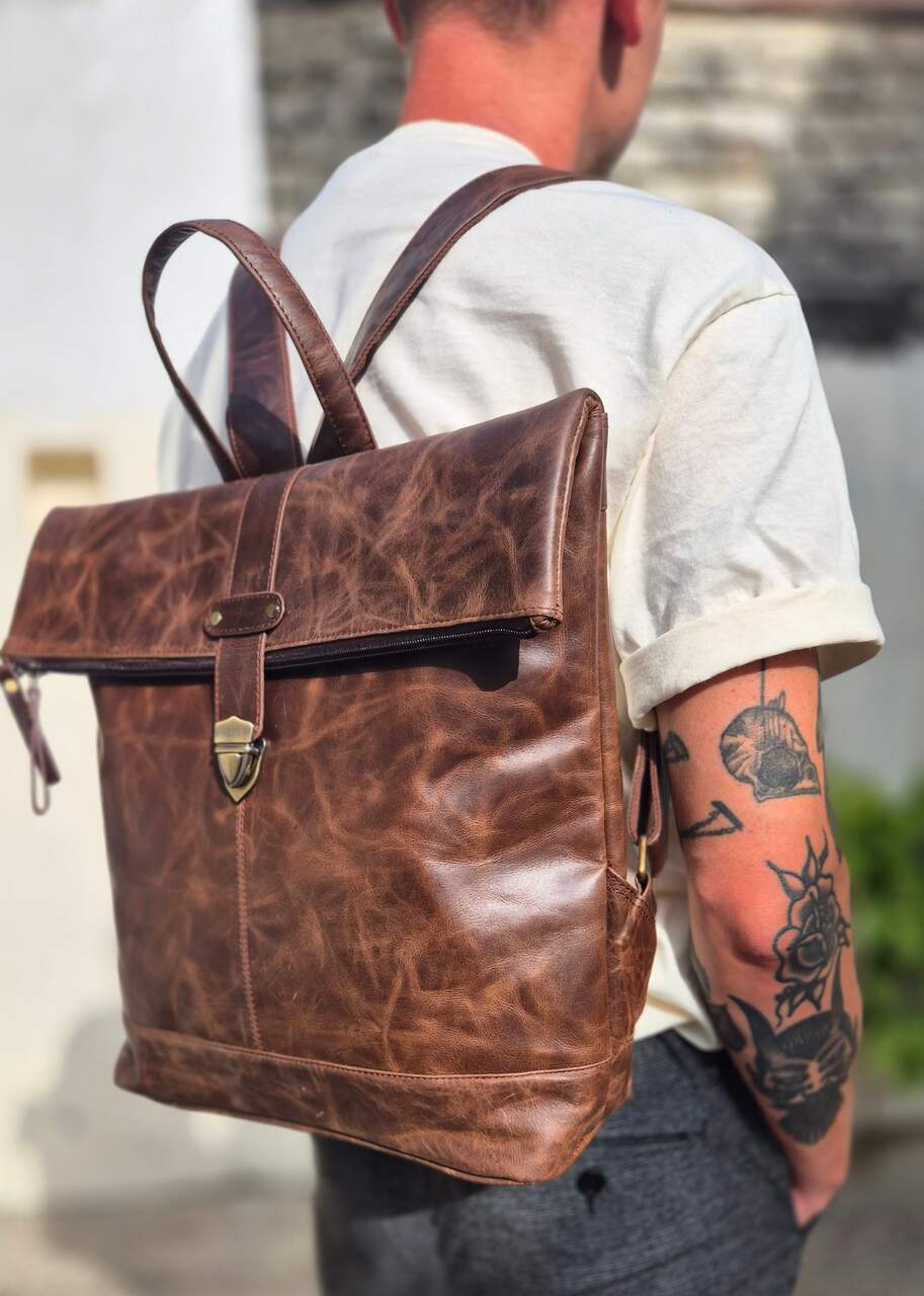 Ręcznie wykonany plecak ze skóry naturalnej, stworzony w Indiach. Plecak wykonany jest ze starannie wyselekcjonowanych materiałów, które gwarantują trwałość i naturalny charakter skóry. Konstrukcja plecaka jest zwijana, co nadaje mu minimalistyczny, ale funkcjonalny wygląd i możliwość regulacji objętości. Wykończenia są precyzyjne, a szwy mocne, co zapewnia długą żywotność nawet przy codziennym użytkowaniu. Naturalne odcienie skóry podkreślają autentyczność produktu i każdy egzemplarz ma unikalną fakturę skóry. Plecak łączy tradycyjne rzemiosło z praktycznością, idealny do miejskiego stylu życia oraz podróży. Dzięki kompaktowej formie, po złożeniu zajmuje niewiele miejsca, a po rozłożeniu zyskuje pełną pojemność na codzienne rzeczy.