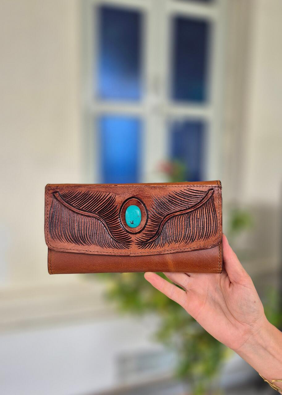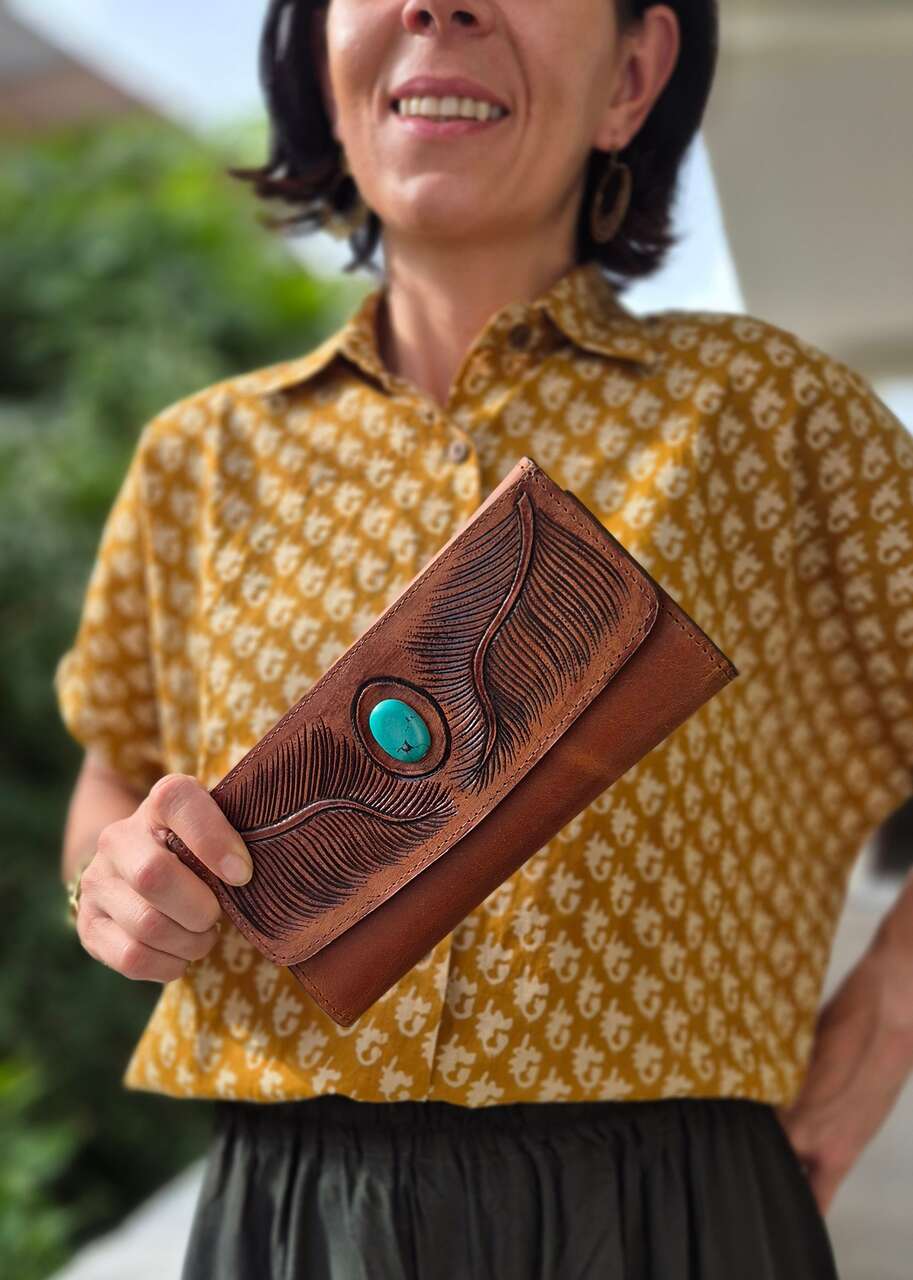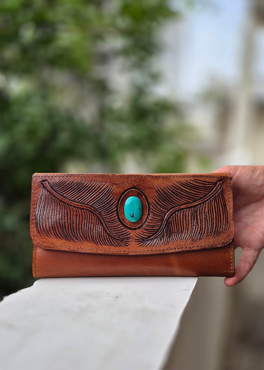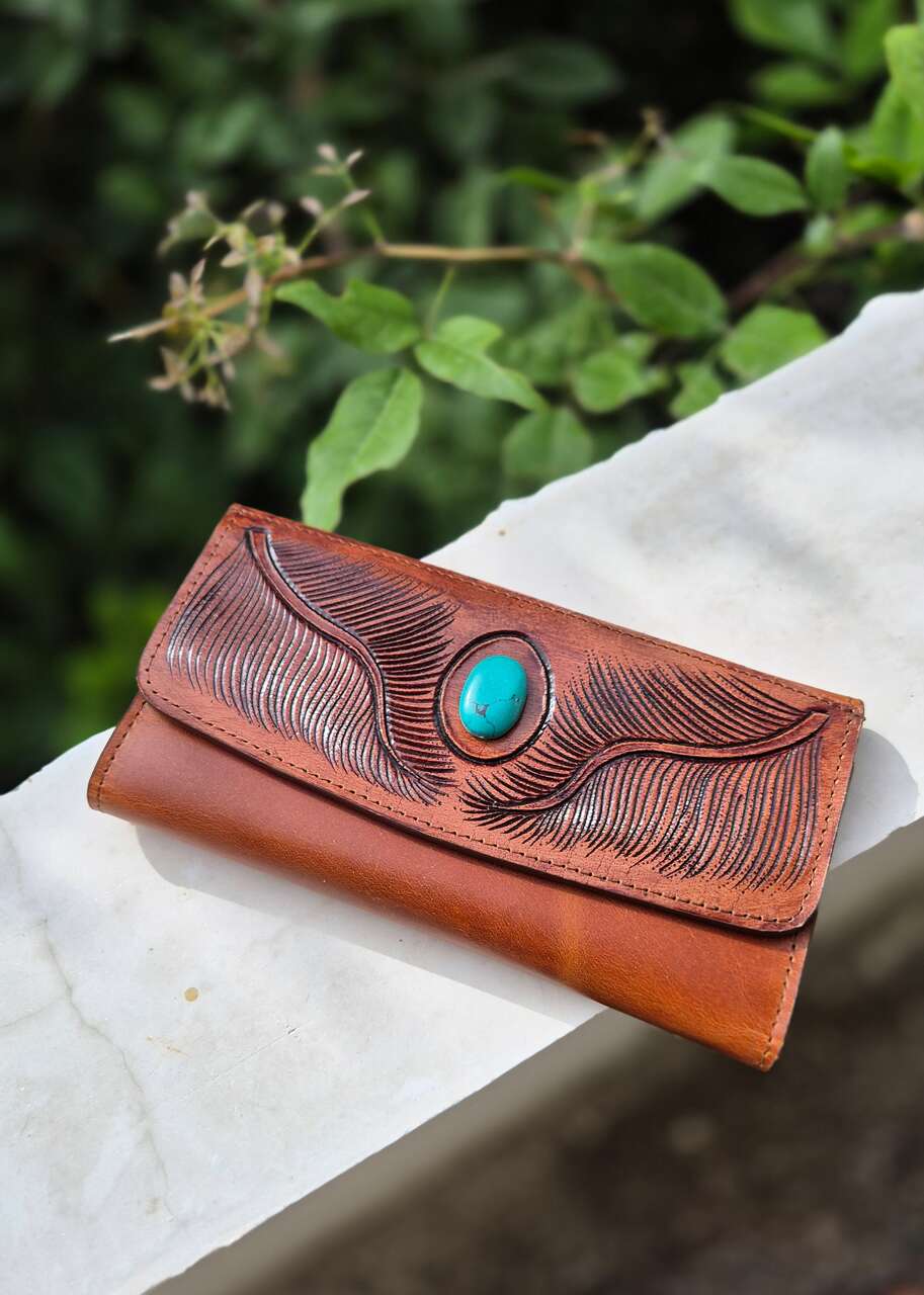 Unikatowy portfel, stworzony ręcznie w Indiach. Wykonany z wysokiej jakości skóry, która z czasem nabiera charakteru i naturalnego połysku. Motywy rzeźbione na powierzchni portfela podkreślają indywidualność i ręczne wykonanie, każdy egzemplarz jest niepowtarzalny. Kieszenie i przegrody są zaprojektowane z myślą o maksymalnej funkcjonalności, mieszcząc karty, banknoty i monety. Produkt odznacza się trwałością i dbałością o szczegóły, co czyni go idealnym dodatkiem na lata.