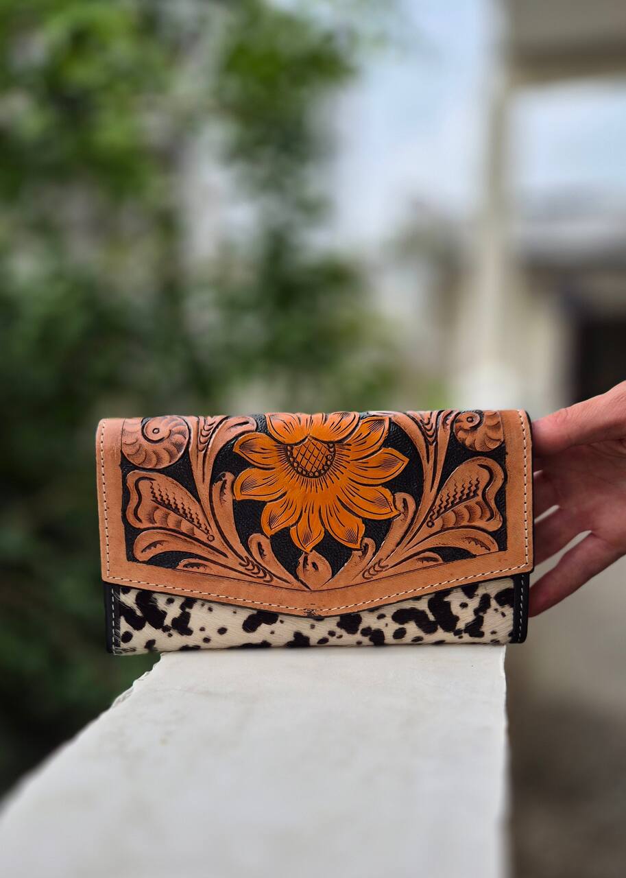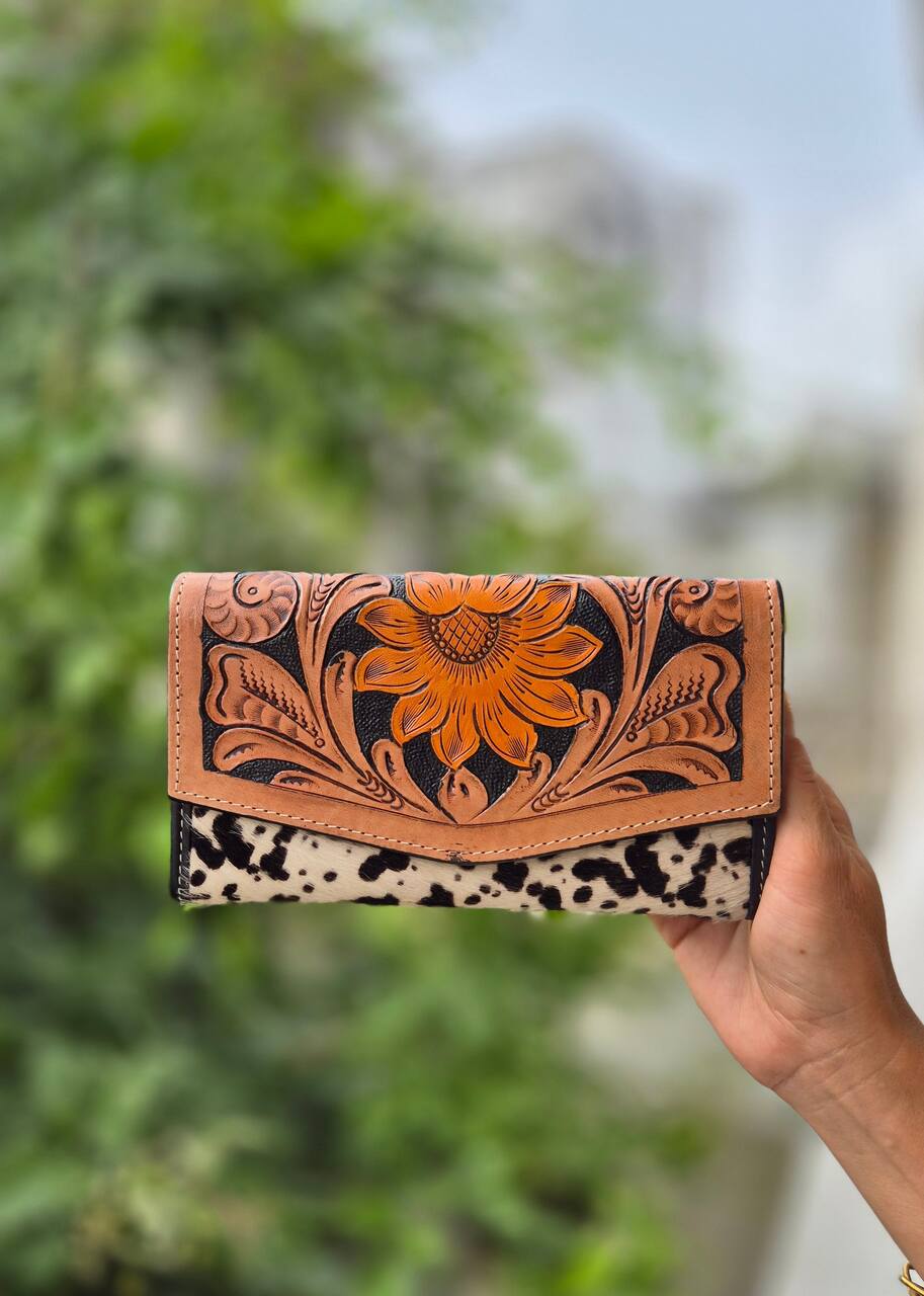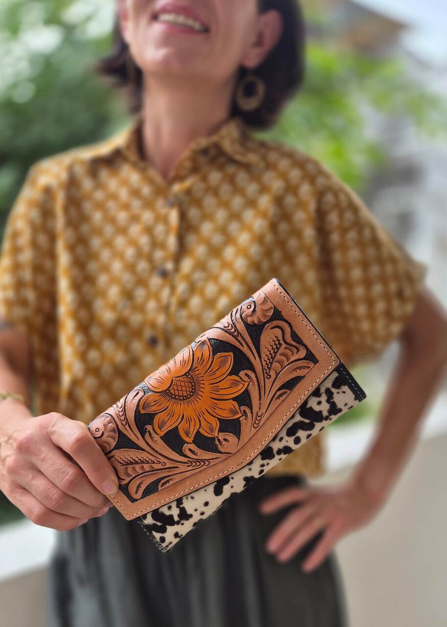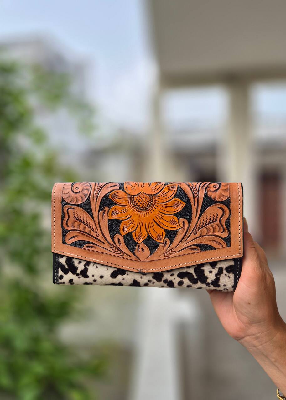 Portfel zdobiony ręcznym rzeźbieniem w skórze oraz naturalnymi łatkami, wykonany w Indiach. To unikatowy dodatek, łączący tradycyjne rzeźbienia z charakterem używanych skór i widocznym włosiem, które nadają mu niepowtarzalny wygląd. Wykonany z wysokiej jakości skóry, która z czasem nabiera patyny i naturalnego połysku, podkreślając ręczne detale. Ręczne rzeźbienie prezentuje misternie wycięte motywy, a łatki skóry dodają eklektycznego uroku i autentyczności. Kieszenie i przegrody zaprojektowano z myślą o maksymalnej funkcjonalności, mieszcząc karty, banknoty i monety. Dlatego portfel łączy trwałość z oryginalnym stylem, będąc wyrazistym dodatkiem na co dzień lub na specjalne okazje. Każdy egzemplarz jest niepowtarzalny, ponieważ ręczne wykonanie gwarantuje subtelne różnice w każdym detalu.