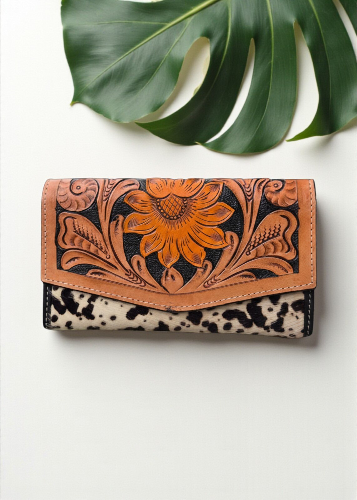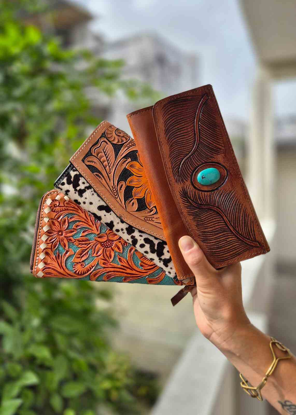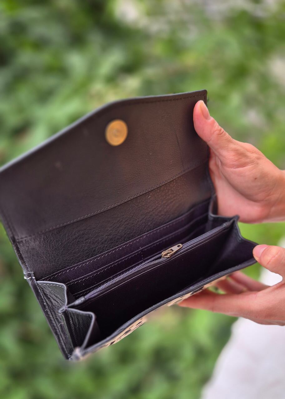 Portfel zdobiony ręcznym rzeźbieniem w skórze oraz naturalnymi łatkami, wykonany w Indiach. To unikatowy dodatek, łączący tradycyjne rzeźbienia z charakterem używanych skór i widocznym włosiem, które nadają mu niepowtarzalny wygląd. Wykonany z wysokiej jakości skóry, która z czasem nabiera patyny i naturalnego połysku, podkreślając ręczne detale. Ręczne rzeźbienie prezentuje misternie wycięte motywy, a łatki skóry dodają eklektycznego uroku i autentyczności. Kieszenie i przegrody zaprojektowano z myślą o maksymalnej funkcjonalności, mieszcząc karty, banknoty i monety. Dlatego portfel łączy trwałość z oryginalnym stylem, będąc wyrazistym dodatkiem na co dzień lub na specjalne okazje. Każdy egzemplarz jest niepowtarzalny, ponieważ ręczne wykonanie gwarantuje subtelne różnice w każdym detalu.