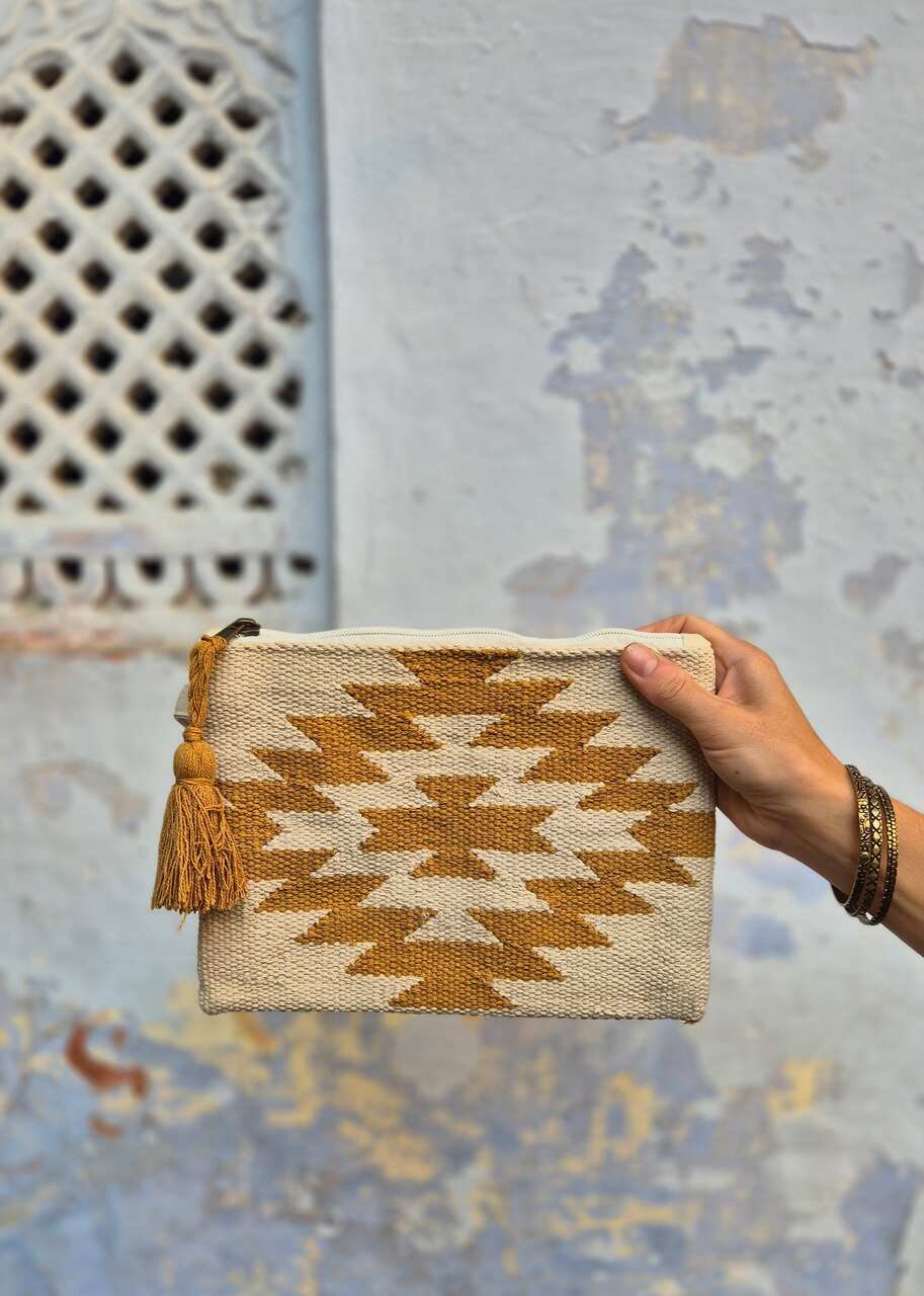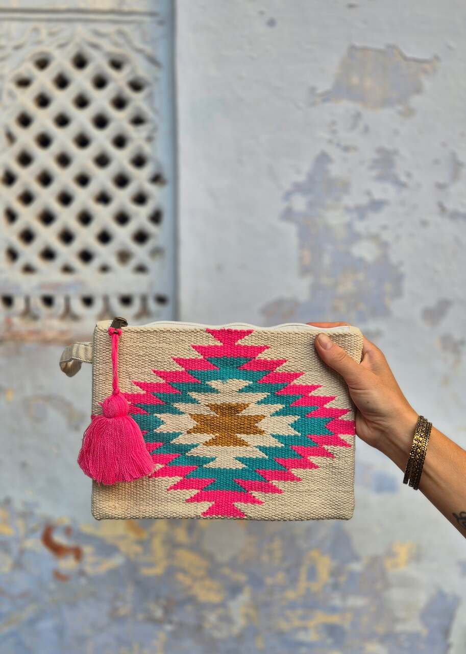 Tkana saszetka o unikalnym, geometrycznym wzorze łączy kolorowy design z tradycyjnym rzemiosłem indyjskim. Kompaktowe rozmiary i lekka konstrukcja sprawiają, że idealnie mieści niezbędne drobiazgi na co dzień. Wytrzymałe tkanie oraz solidne wykończenia zapewniają trwałość i długotrwałe użytkowanie. Uniwersalny styl pasuje do wielu ubrań i okazji, dodając charakteru każdej stylizacji. Produkt wyprodukowany w Indiach podkreśla autentyczność i wsparcie lokalnych rzemieślników.