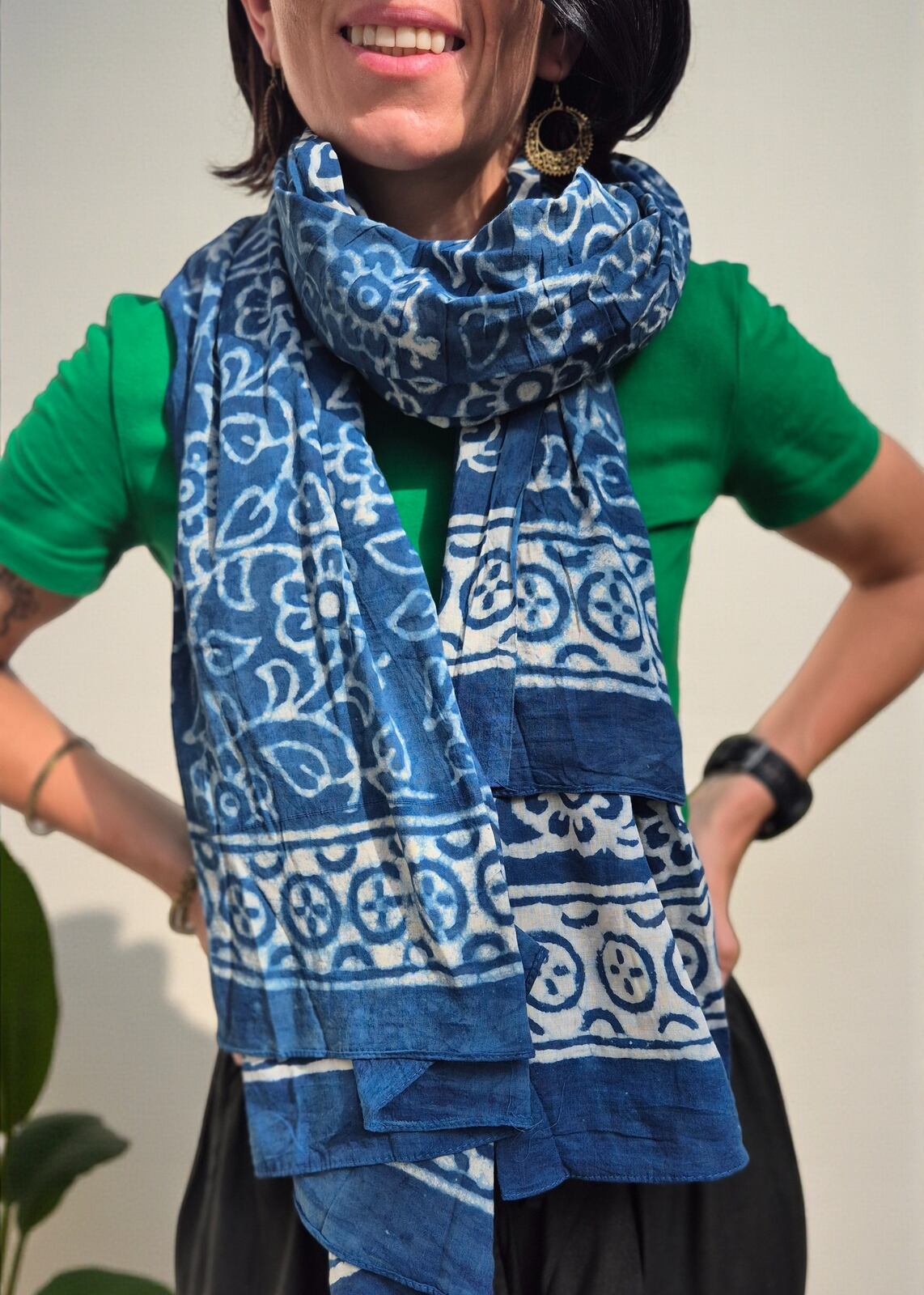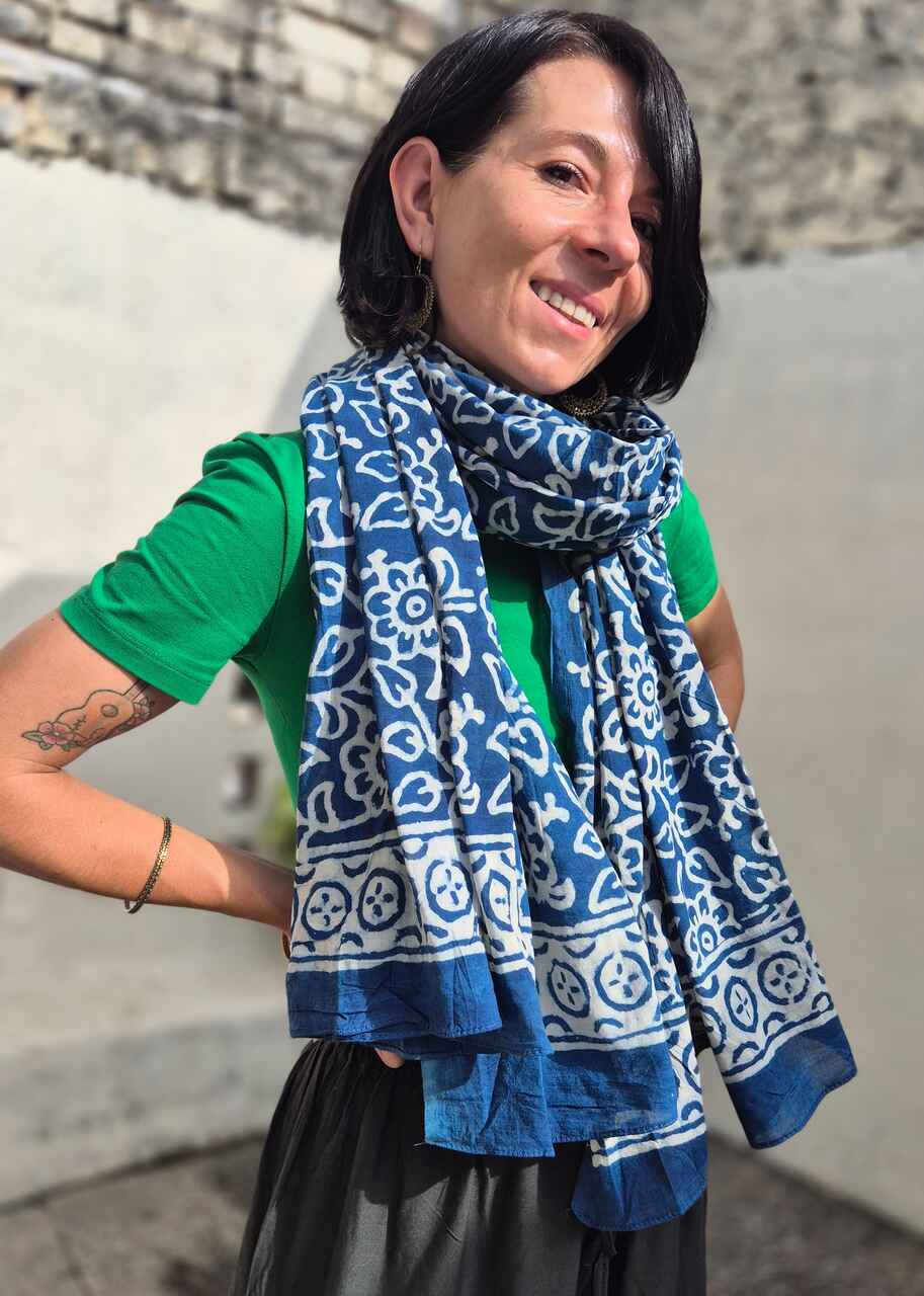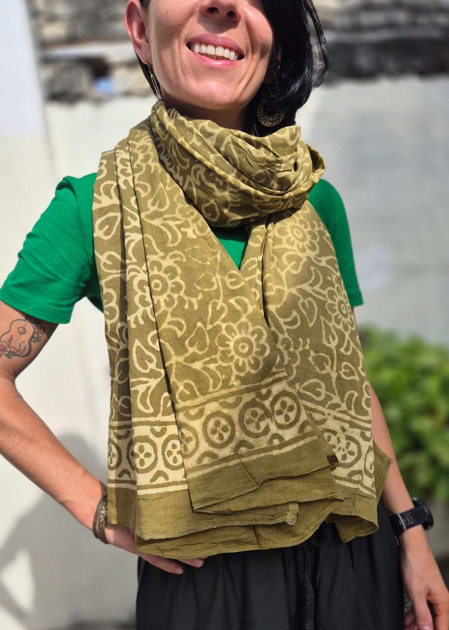 Cienki bawełniany szal zdobiony metodą wood block stamping, wykonany w Indiach, łączy lekkość tkaniny z unikalnym, ręcznie wykonanym wzorem. Delikatny splot i miękkość materiału zapewniają komfort noszenia w chłodniejsze dni, a jednocześnie łatwość warstwowania z innymi elementami garderoby. Charakterystyczny print stworzony poprzez ręczne nanoszenie wzorów nadaje szalowi wyjątkowy, artystyczny charakter i niepowtarzalny wygląd. Dzięki naturalnym barwnikom i starannemu wykonaniu szal oferuje trwałość oraz subtelny połysk koloru. To doskonały dodatek do casualowych i eleganckich stylizacji, który podkreśla indywidualność każdej osoby noszącej.