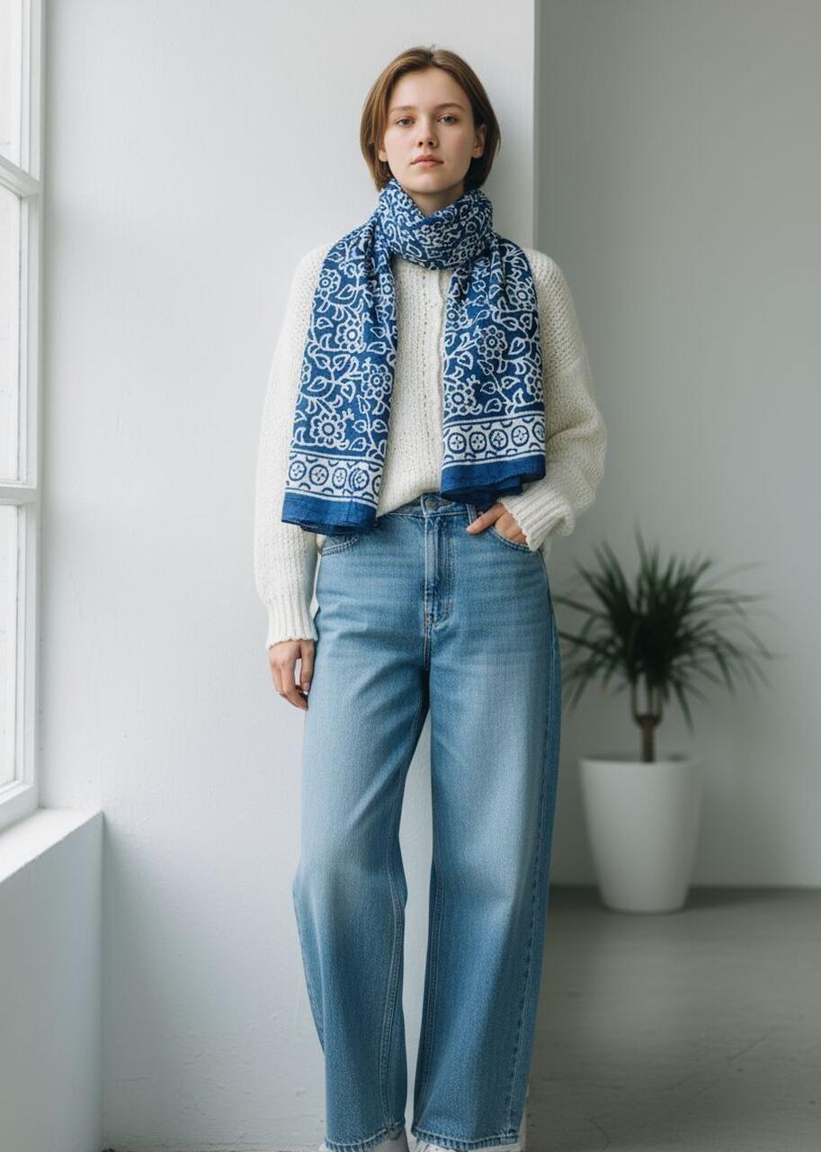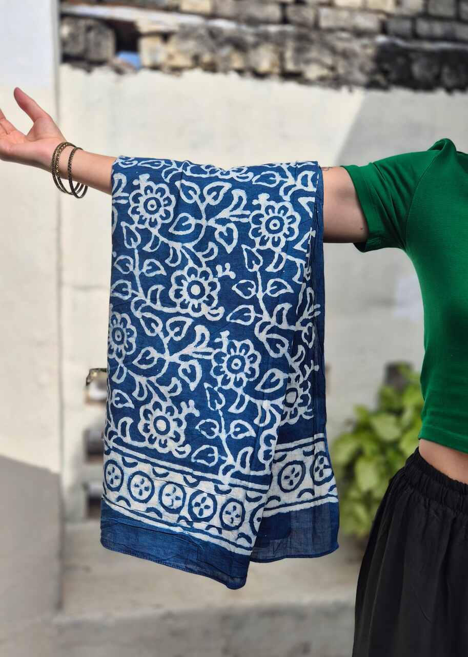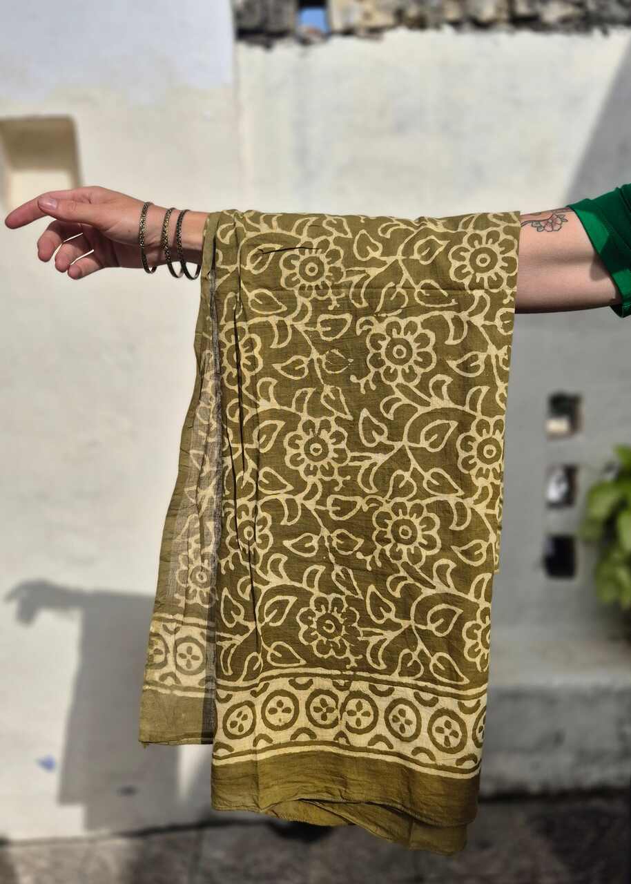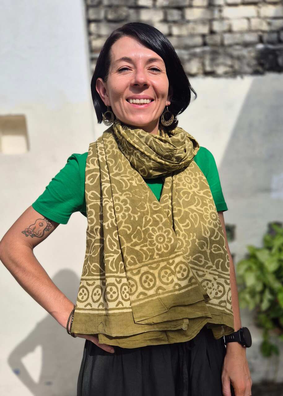 Cienki bawełniany szal zdobiony metodą wood block stamping, wykonany w Indiach, łączy lekkość tkaniny z unikalnym, ręcznie wykonanym wzorem. Delikatny splot i miękkość materiału zapewniają komfort noszenia w chłodniejsze dni, a jednocześnie łatwość warstwowania z innymi elementami garderoby. Charakterystyczny print stworzony poprzez ręczne nanoszenie wzorów nadaje szalowi wyjątkowy, artystyczny charakter i niepowtarzalny wygląd. Dzięki naturalnym barwnikom i starannemu wykonaniu szal oferuje trwałość oraz subtelny połysk koloru. To doskonały dodatek do casualowych i eleganckich stylizacji, który podkreśla indywidualność każdej osoby noszącej.