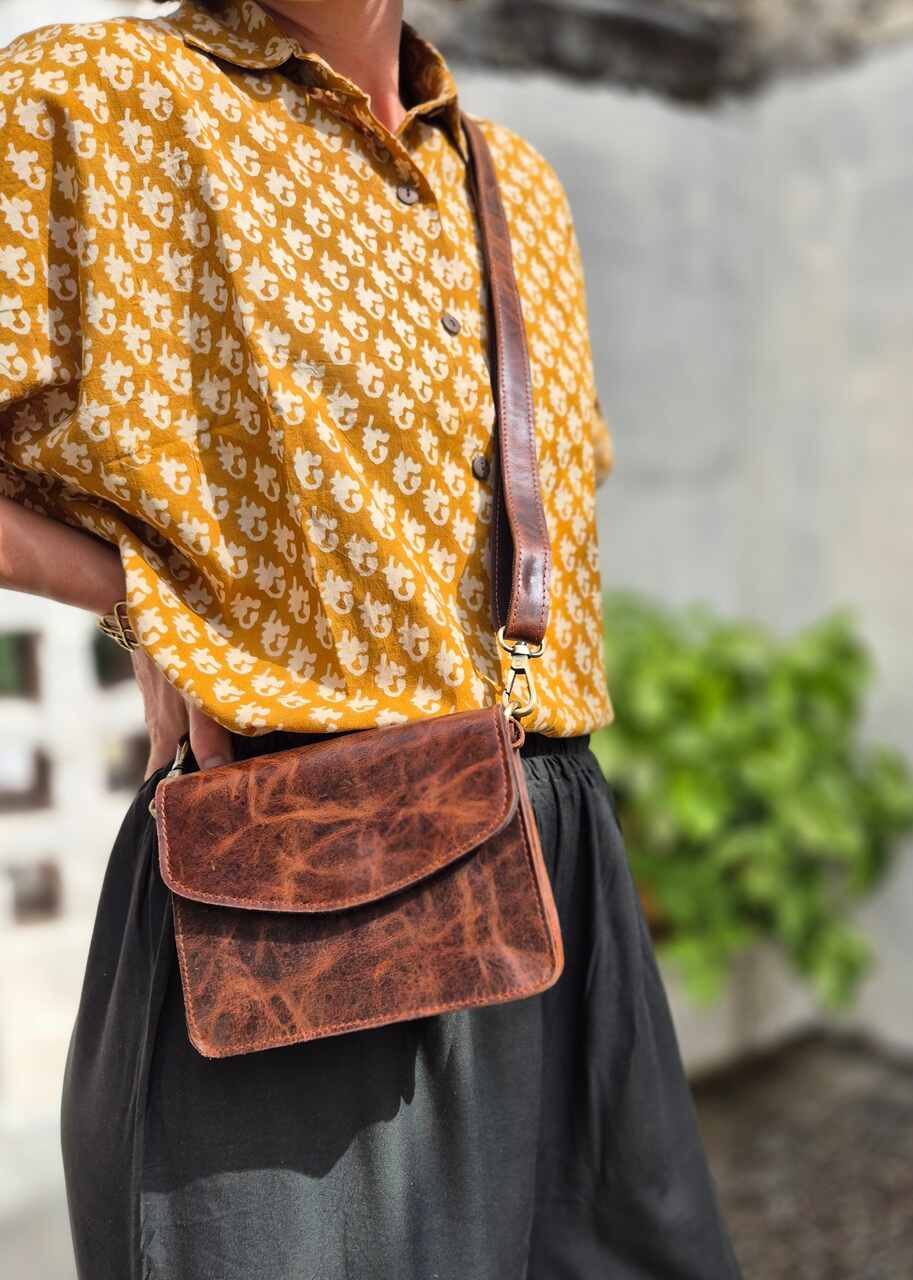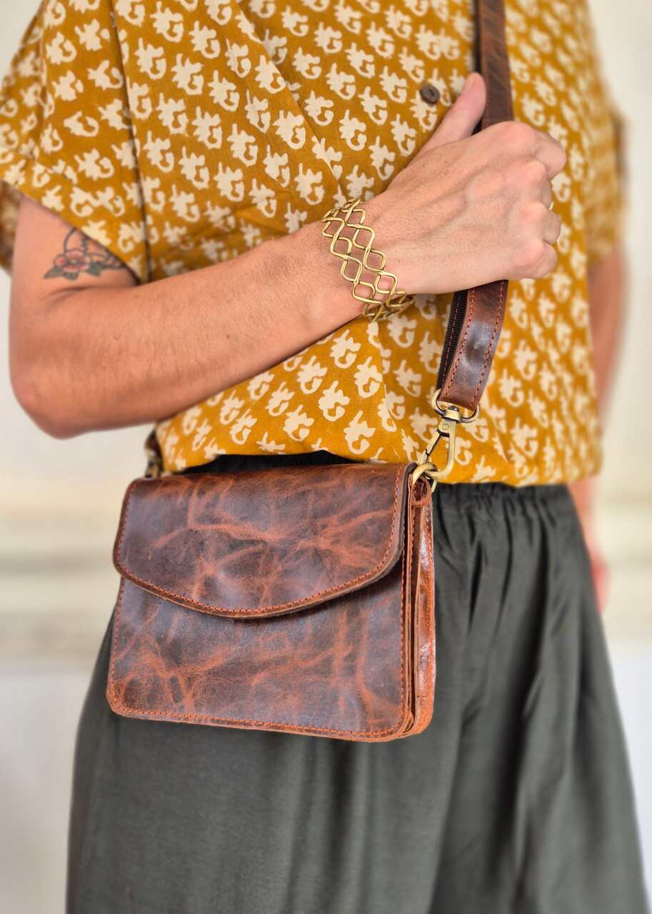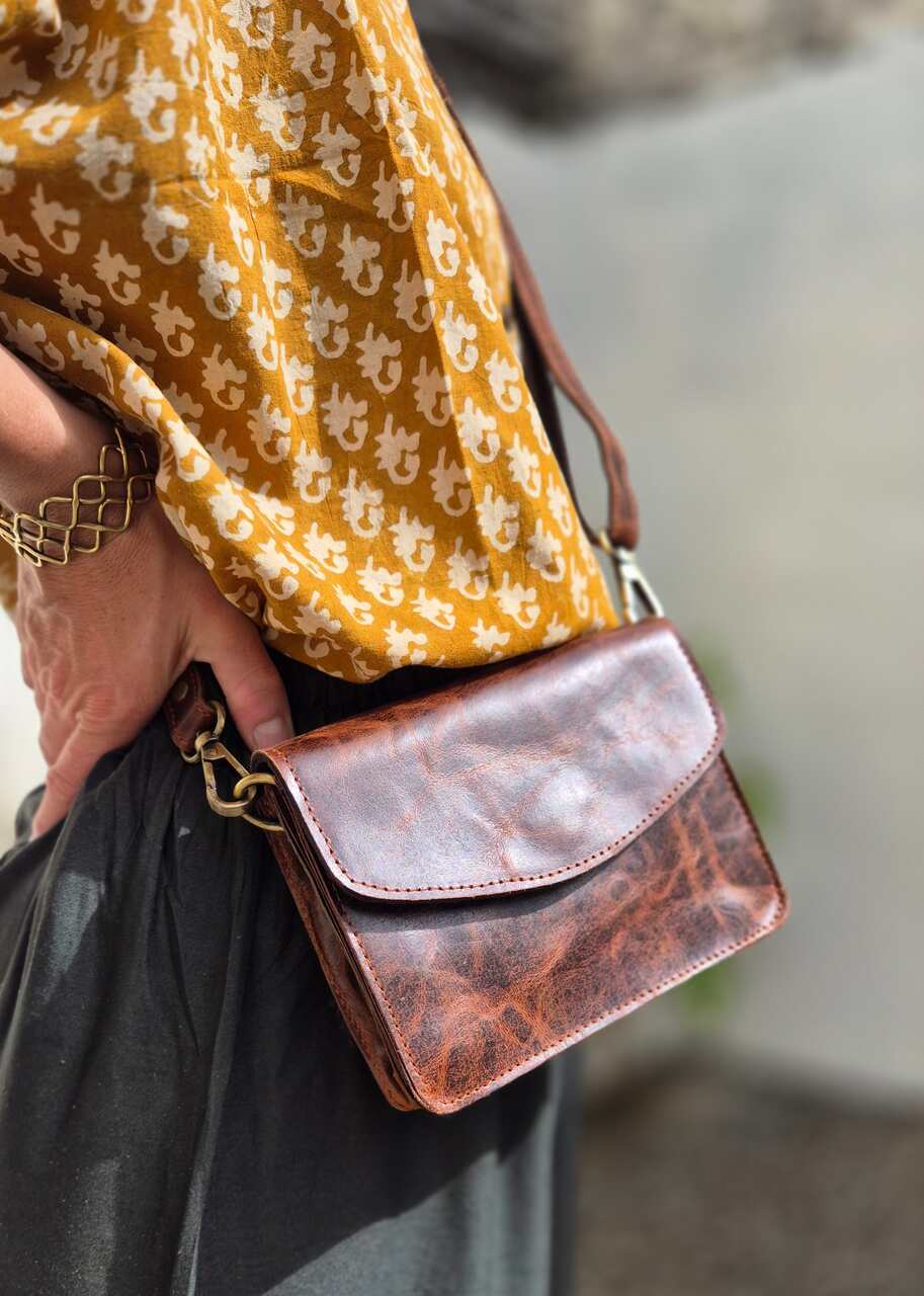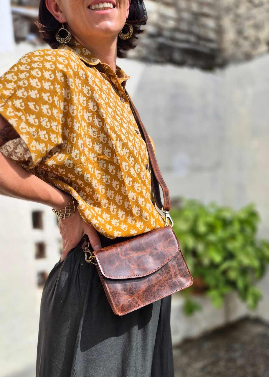Mała klasyczna torebka ze skóry naturalnej w ciepłym brązowym kolorze. Fason o prostych, eleganckich liniach łączy w sobie szyk i uniwersalność, doskonale pasując do codziennych i wieczorowych stylizacji. Wykończenia są solidne, a starannie szyte krawędzie gwarantują trwałość na długi czas użytkowania. Torebka posiada regulowany pasek, umożliwiający noszenie na ramieniu lub skrzyżnie na tułowie. Wnętrze mieści najpotrzebniejsze rzeczy: portfel, telefon, klucze i drobiazgi w porządku. Zapięcie na magnes zapewnia szybki dostęp przy jednoczesnej ochronie zawartości. Uniwersalny brązowy odcień czyni torebkę łatwą do dopasowania do wielu kolorów garderoby, dodając szyku każdej stylizacji.