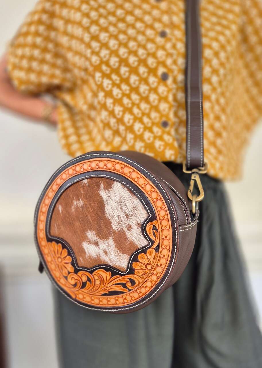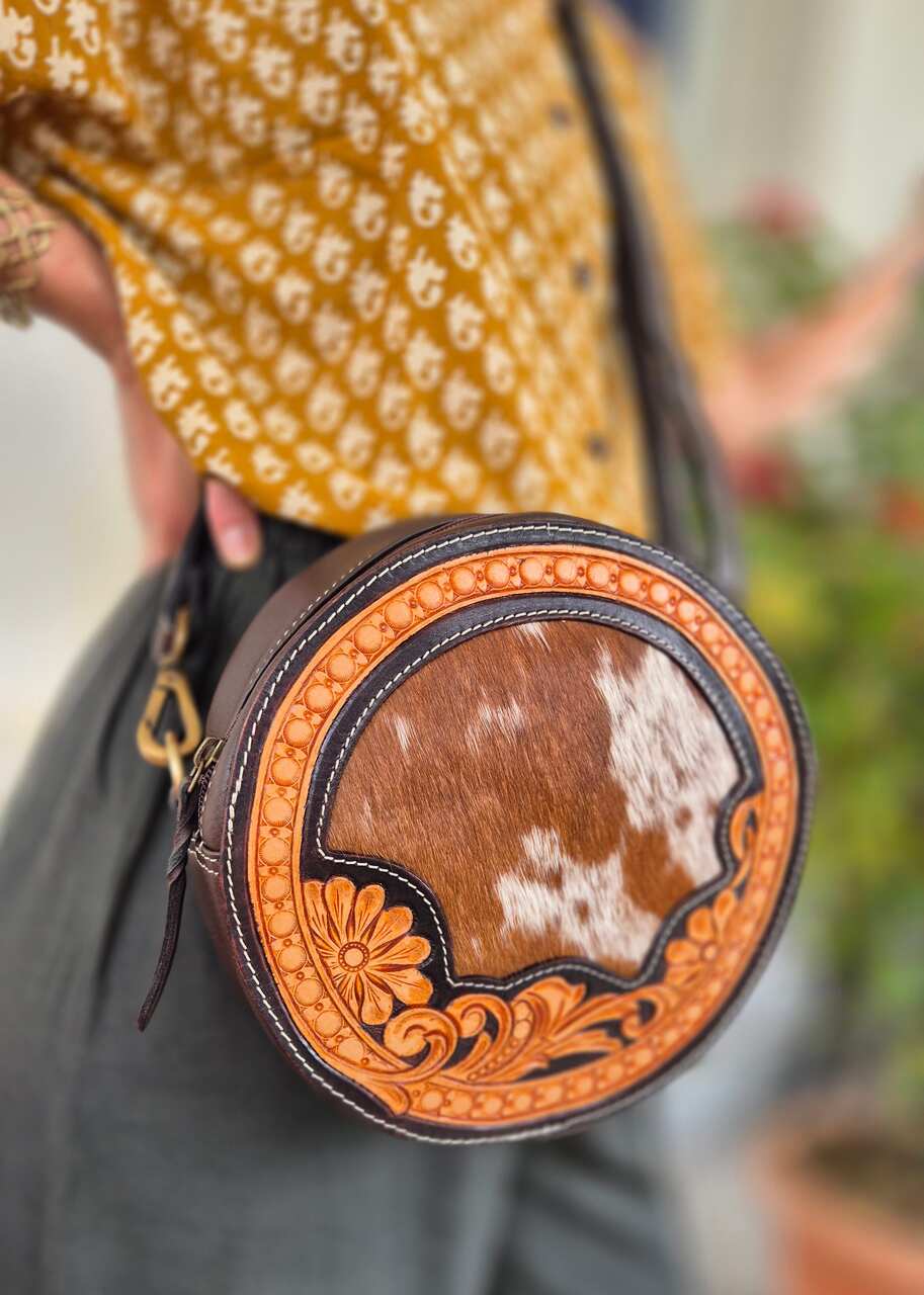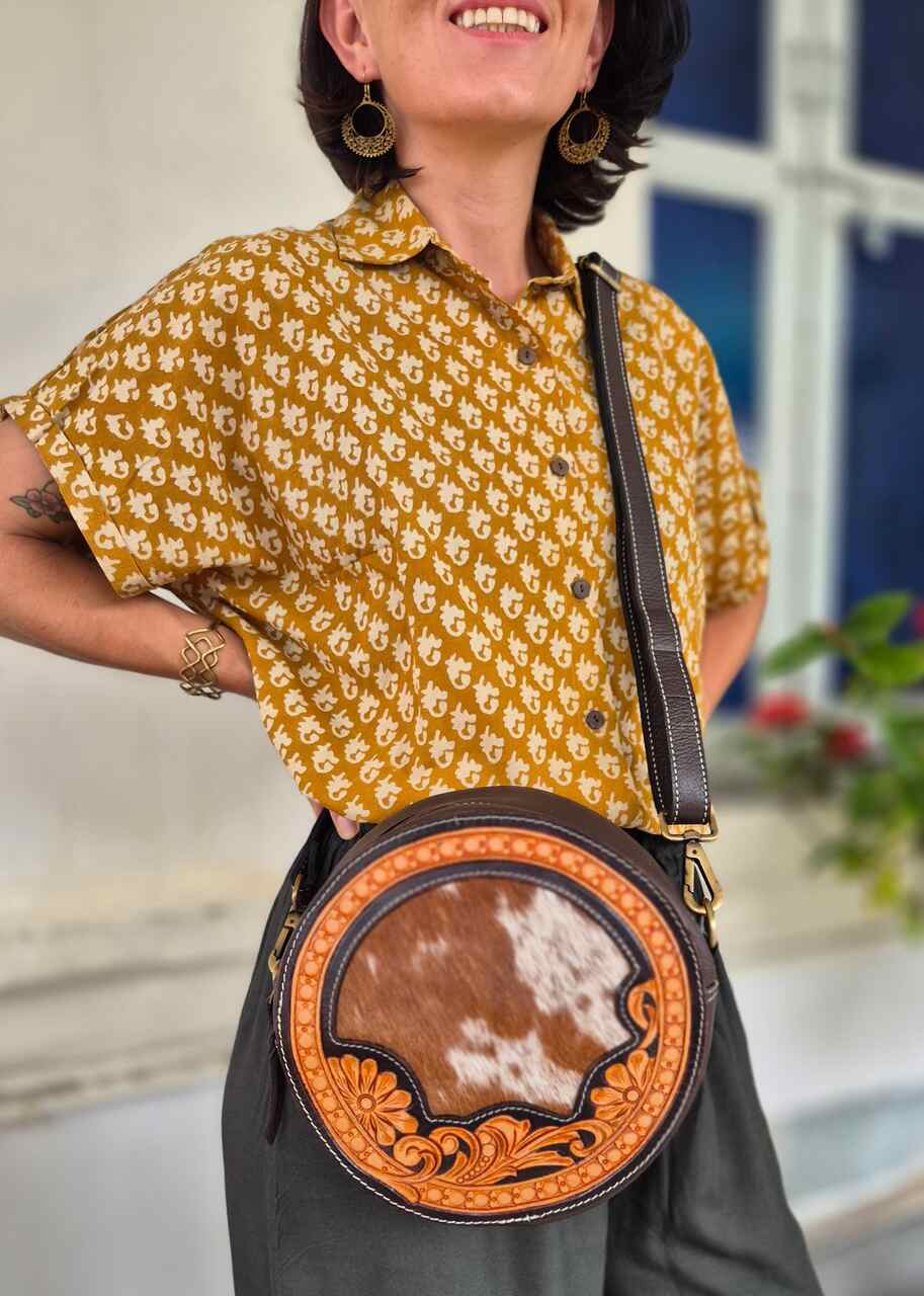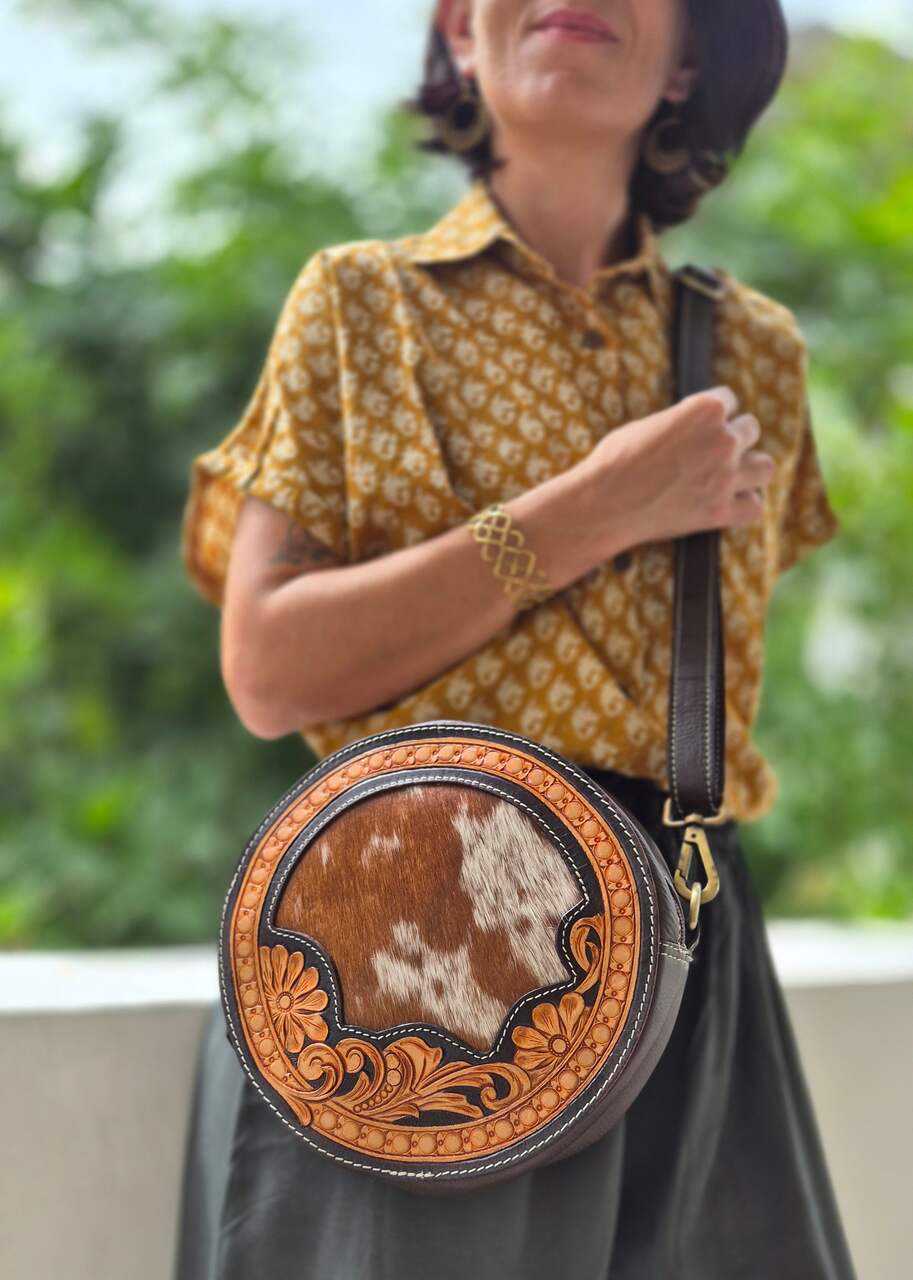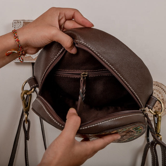 Ręcznie robiona skórzana torebka wykonana w Indiach, co nadaje jej unikalny charakter i autentyczny rys rękodzieła. Kształt torebki jest okrągły, elegancko wyprofilowany, idealny do codziennego użytku i wieczornych stylizacji. Zdobienie w postaci skórzanego rzeźbienia nadaje torbie trójwymiarowy, artystyczny wygląd i podkreśla charakter torebki. Wysoka jakość materiału zapewnia trwałość i długowieczność, a ręczne wykonanie dodaje torbie wyjątkowej wartości. Kompaktowe wnętrze z praktyczną przegródką mieści niezbędne drobiazgi, zachowując poręczność noszenia. Zgodna z różnymi stylami — od casual po bardziej eleganckie outfity — dzięki subtelnej kolorystyce i klasycznej koncepcji rzeźbienia. Doskonały wybór dla miłośników rękodzieła, unikalnych dodatków i wysokiej jakości skórzanych produktów.