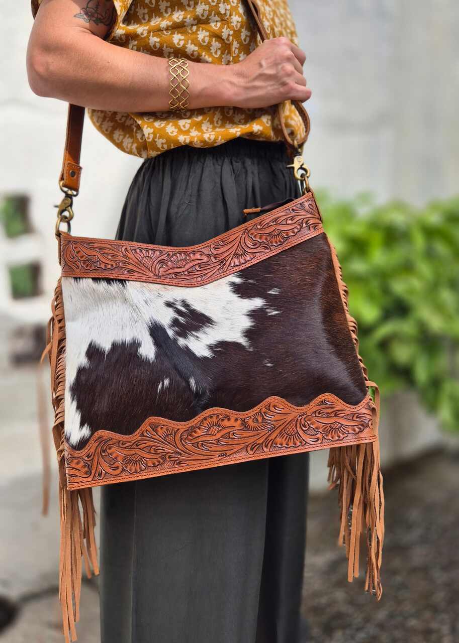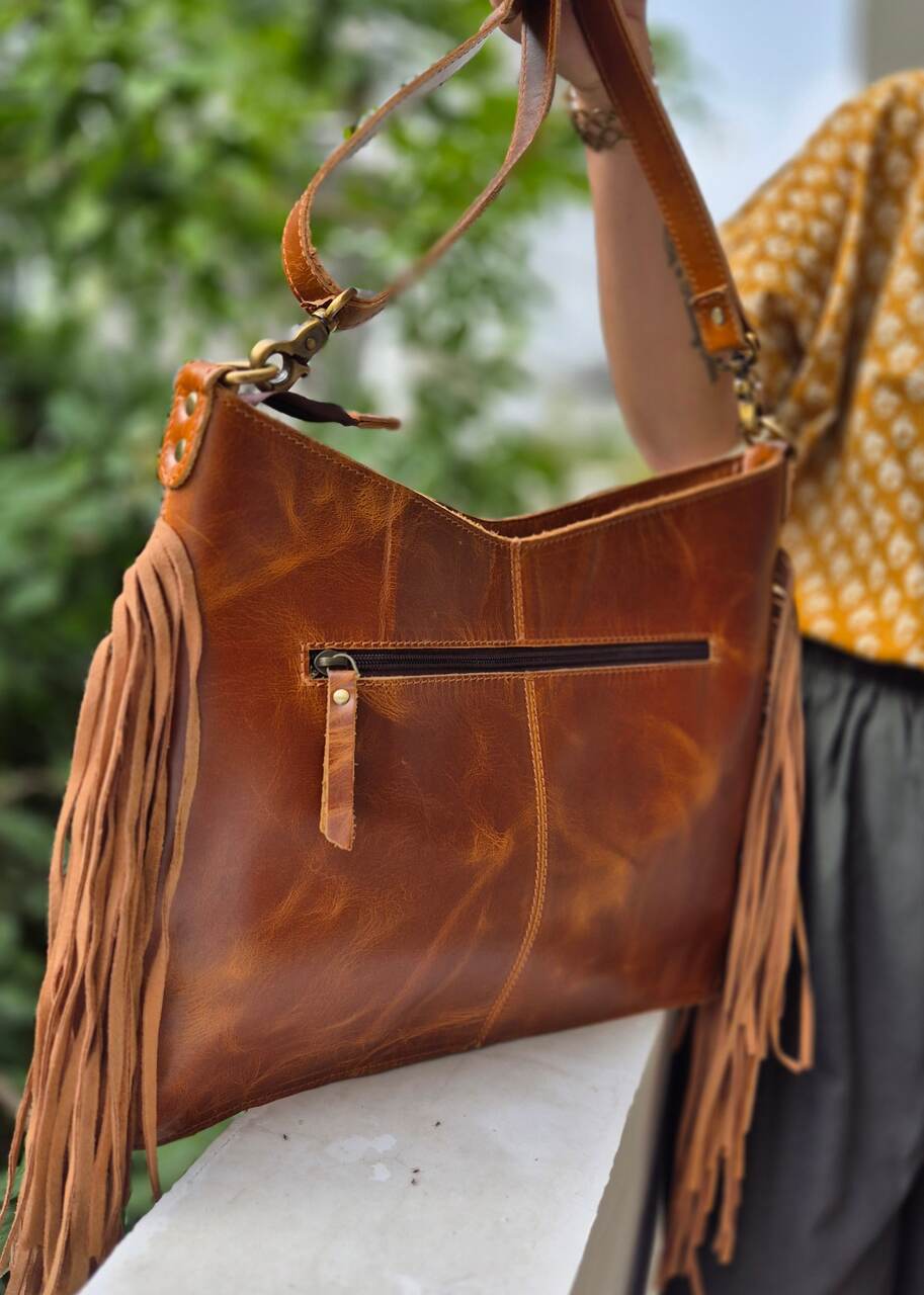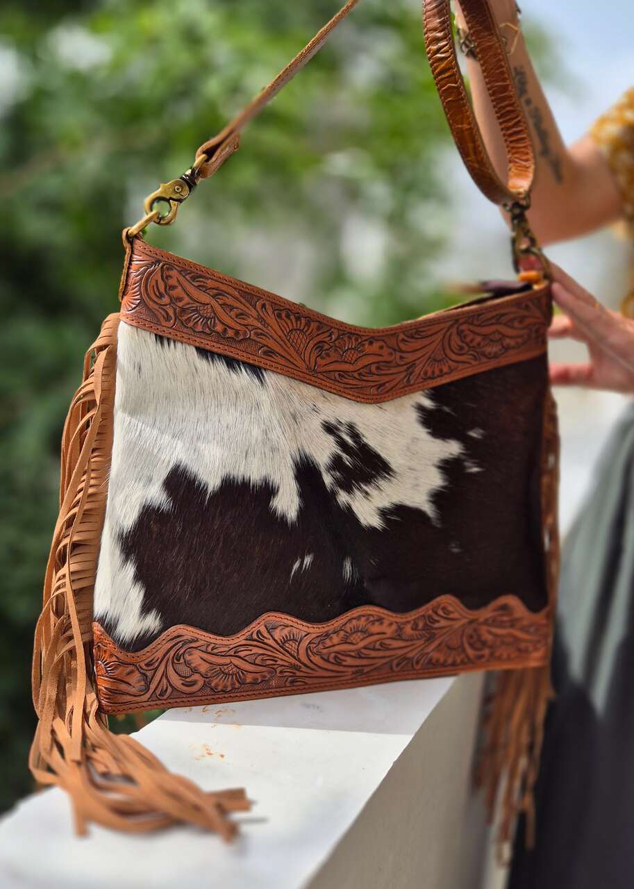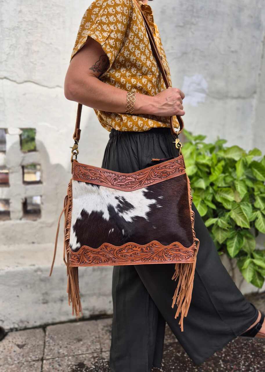 Torebka wykonana w Indiach ze skóry naturalnej zdobiona rzeźbieniem w skórze, naturalnym włosiem oraz frędzlami po bokach, co nadaje jej wyjątkowy, artystyczny charakter. Materiał wysokiej jakości gwarantuje trwałość i elegancki wygląd na lata. Frędzle po bokach dodają torbie lekko boho stylu oraz ruchomość przy każdym kroku. Wnętrze zaprojektowano z myślą o funkcjonalności, mieszcząc niezbędne drobiazgi przy zachowaniu kompaktowego profilu. Torba doskonale sprawdzi się zarówno w codziennych, jak i wieczorowych stylizacjach dzięki uniwersalnej kolorystyce. To doskonały wybór dla osób ceniących rękodzieło, autentyczny charakter i wysoką jakość skórzanych dodatków.