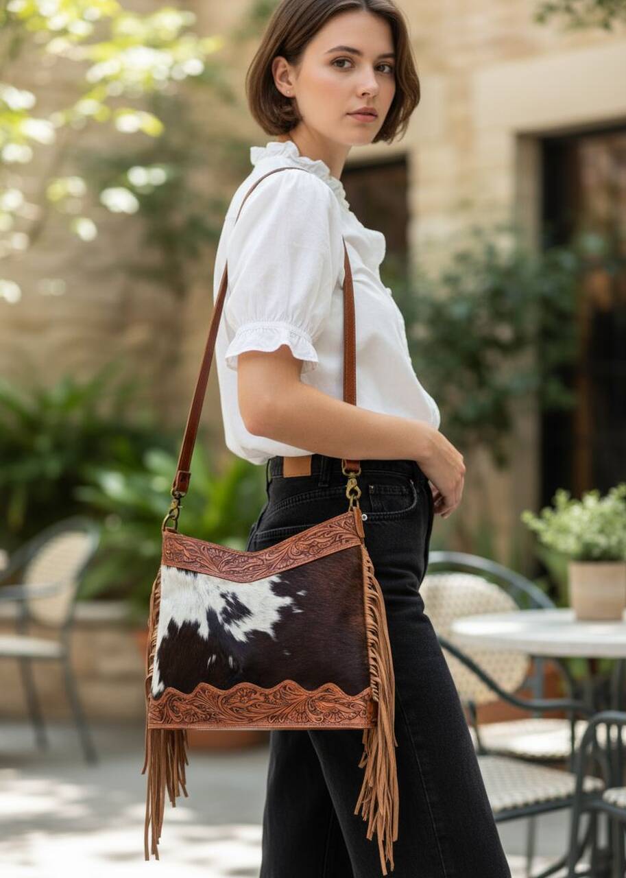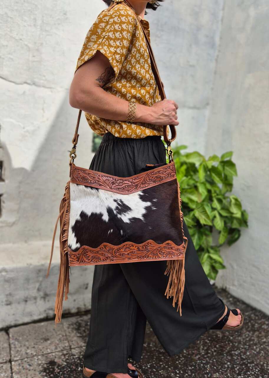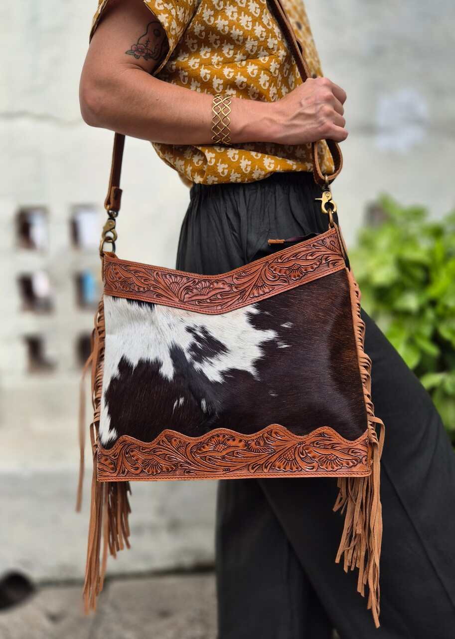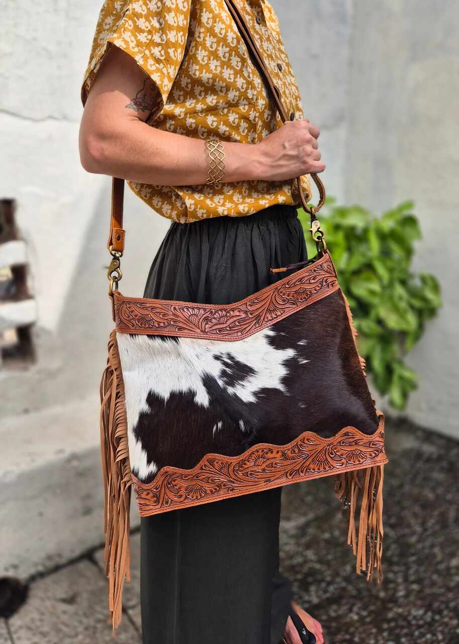 Torebka wykonana w Indiach ze skóry naturalnej zdobiona rzeźbieniem w skórze, naturalnym włosiem oraz frędzlami po bokach, co nadaje jej wyjątkowy, artystyczny charakter. Materiał wysokiej jakości gwarantuje trwałość i elegancki wygląd na lata. Frędzle po bokach dodają torbie lekko boho stylu oraz ruchomość przy każdym kroku. Wnętrze zaprojektowano z myślą o funkcjonalności, mieszcząc niezbędne drobiazgi przy zachowaniu kompaktowego profilu. Torba doskonale sprawdzi się zarówno w codziennych, jak i wieczorowych stylizacjach dzięki uniwersalnej kolorystyce. To doskonały wybór dla osób ceniących rękodzieło, autentyczny charakter i wysoką jakość skórzanych dodatków.