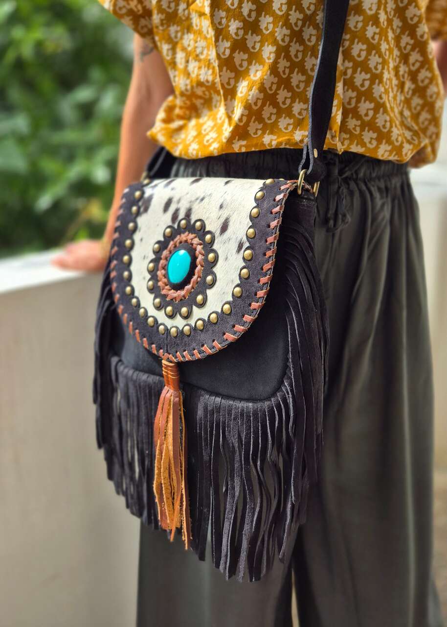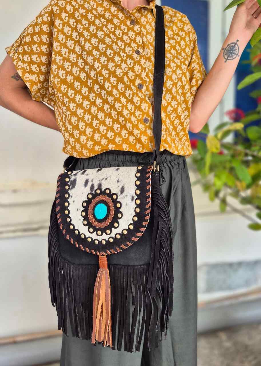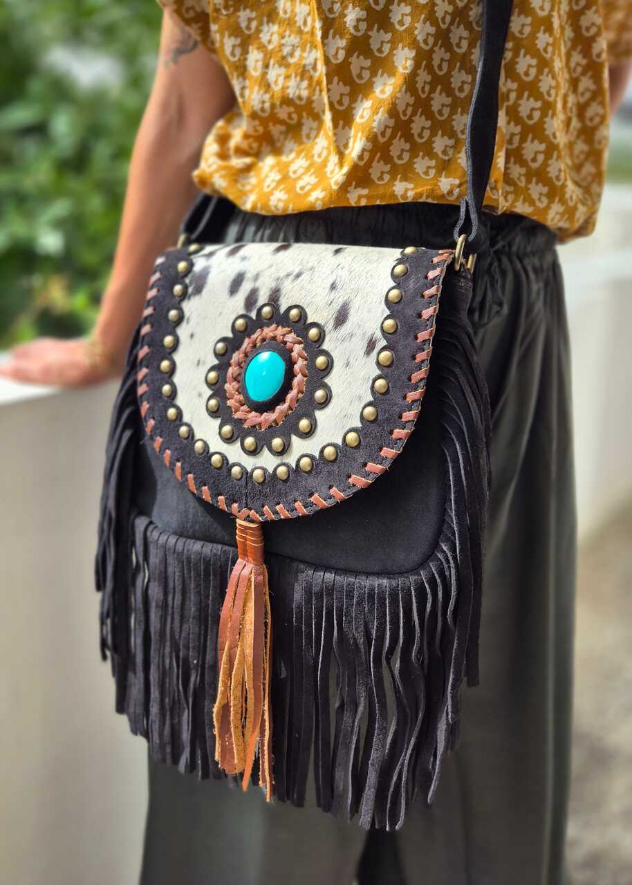 Ręcznie robiona torebka z grubej skóry zamszowej, ozdobiona frędzlami i naturalnym włosiem z łatami. Każdy egzemplarz wykonany jest z dbałością o szczegóły, co nadaje mu wyjątkową trwałość i charakter. Zamszowa faktura skóry dodaje subtelnego, eleganckiego wyglądu oraz miękkości w dotyku. Frędzle tworzą dynamiczny efekt ruchu, przyciągający uwagę i podkreślający casualowy styl. Naturalne włosie dodaje oryginalności oraz nietuzinkowego akcentu, podkreślając rękodzielniczy charakter produktu. Torba jest funkcjonalna, mieści niezbędne drobiazgi, a jednocześnie prezentuje się lekko i modnie. Produkt ręcznie wykonany, co gwarantuje wysoką jakość rzemiosła i unikatowość każdej sztuki.