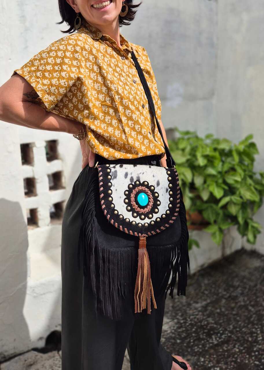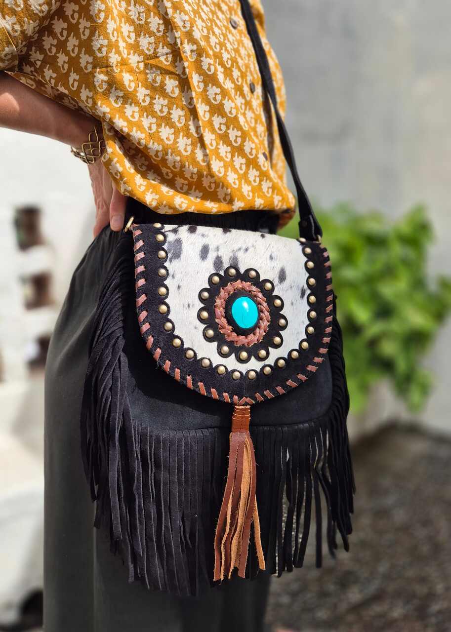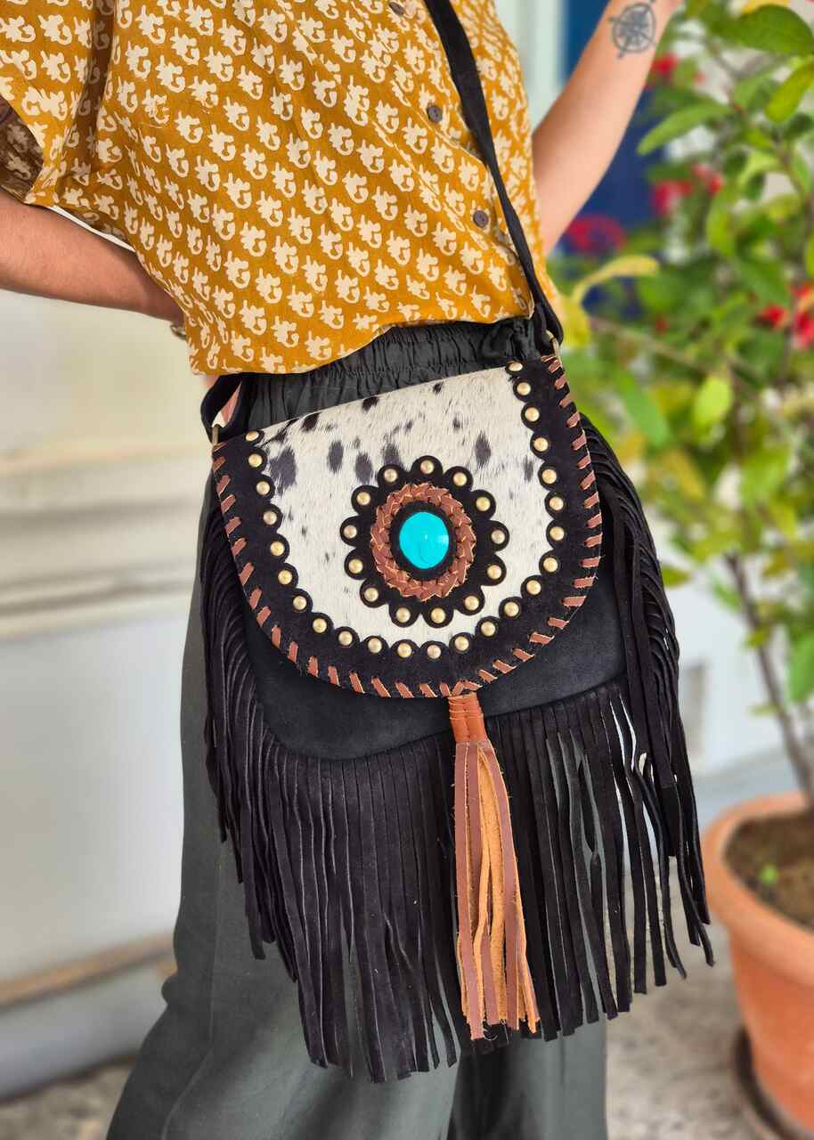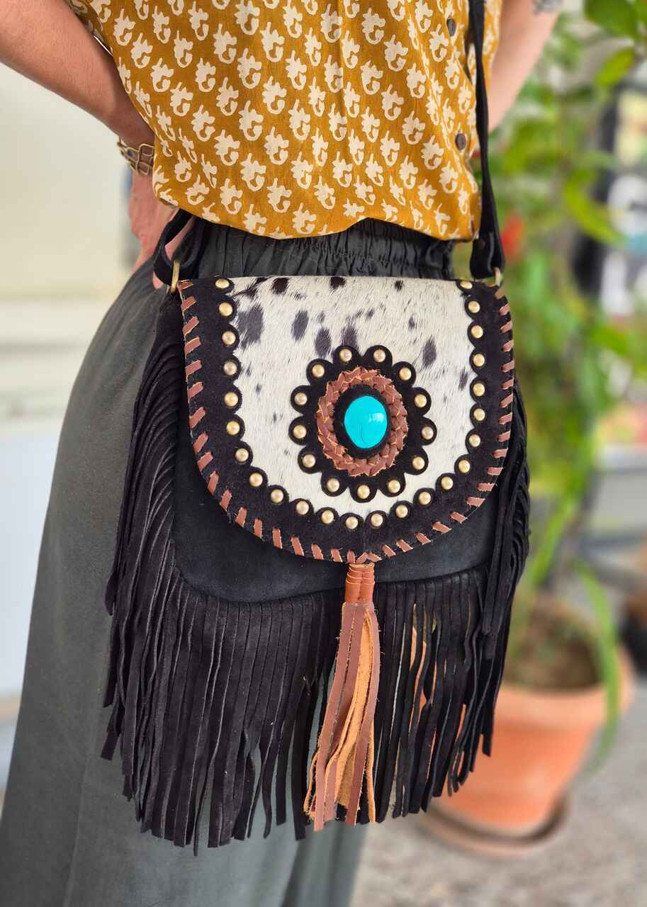 Ręcznie robiona torebka z grubej skóry zamszowej, ozdobiona frędzlami i naturalnym włosiem z łatami. Każdy egzemplarz wykonany jest z dbałością o szczegóły, co nadaje mu wyjątkową trwałość i charakter. Zamszowa faktura skóry dodaje subtelnego, eleganckiego wyglądu oraz miękkości w dotyku. Frędzle tworzą dynamiczny efekt ruchu, przyciągający uwagę i podkreślający casualowy styl. Naturalne włosie dodaje oryginalności oraz nietuzinkowego akcentu, podkreślając rękodzielniczy charakter produktu. Torba jest funkcjonalna, mieści niezbędne drobiazgi, a jednocześnie prezentuje się lekko i modnie. Produkt ręcznie wykonany, co gwarantuje wysoką jakość rzemiosła i unikatowość każdej sztuki.