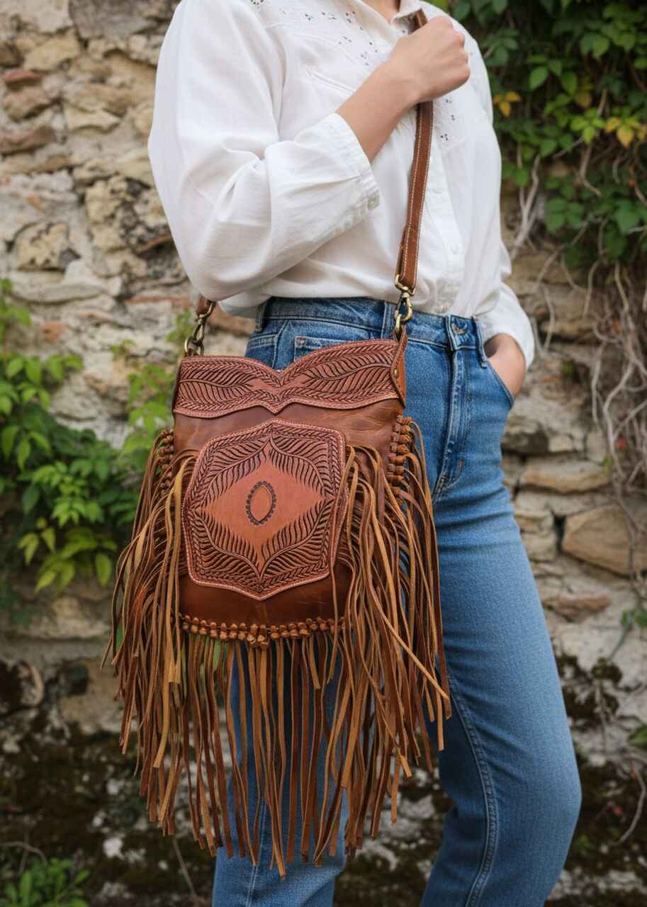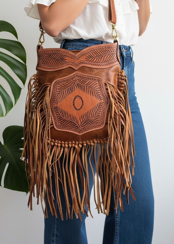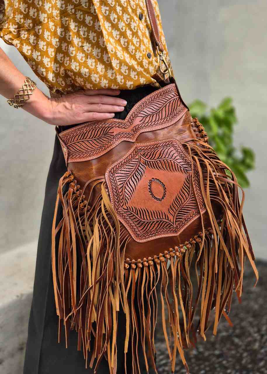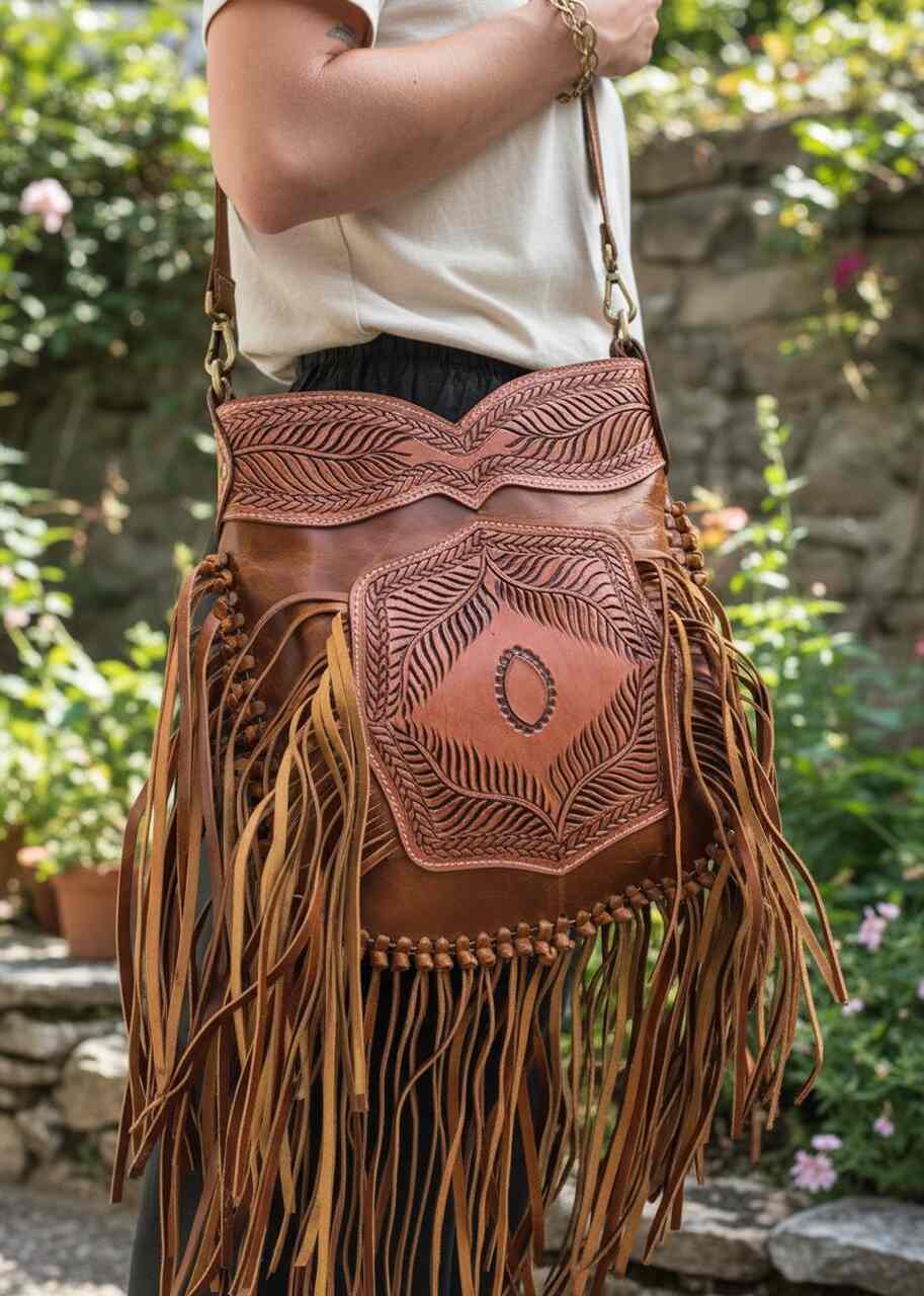 Duża torba typu shopper z ciekawym zdobieniem na skórze, cała wykonana ze skóry z dodatkiem frędzli po bokach. Wytrzymałe szycie i solidny pasek zapewniają wygodny chwyt nawet przy dużym wypełnieniu. Frędzle po bokach dodają lekko boho charakteru i ruchomego, dynamicznego wyglądu. Zdobienie skóry podkreśla naturalne słoje i głębię koloru, nadając torbie niepowtarzalny efekt. Wnętrze wyposażone w praktyczną kieszeń, które pomaga uporządkować drobiazgi. Idealna dla osób ceniących stylowe, trwałe dodatki o wyjątkowym, boho charakterze.