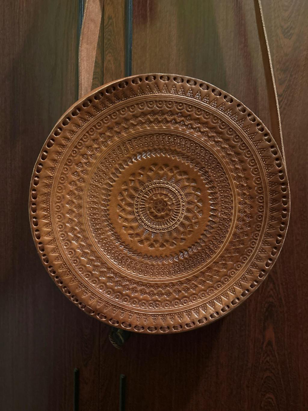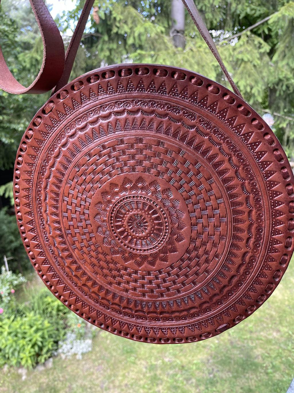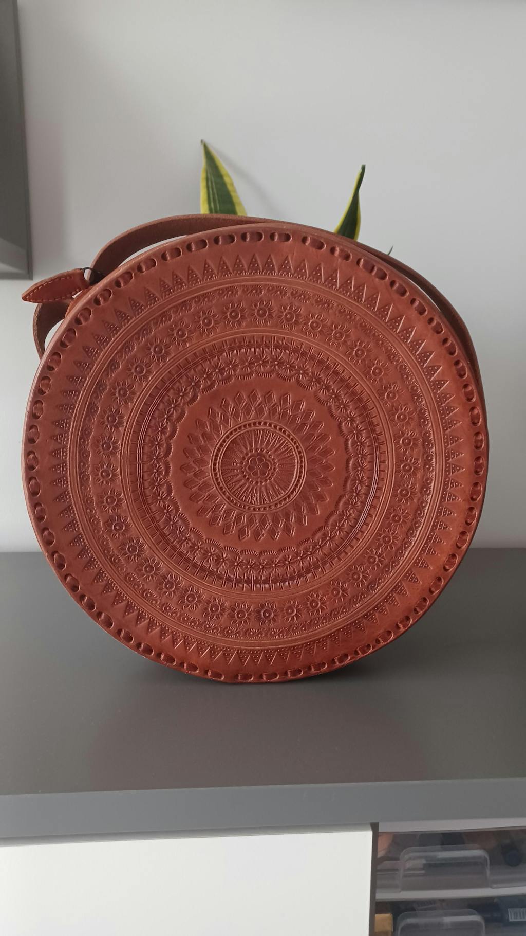 RĘCZNIE WYKONANA SKÓRA: Okrągła torebka wykonana z wysokiej jakości naturalnej skóry juchtowej o grubości 2.2mm, roślinnie garbowanej, malowanej słońcem i zaimpregnowanej dla zwiększonej trwałości