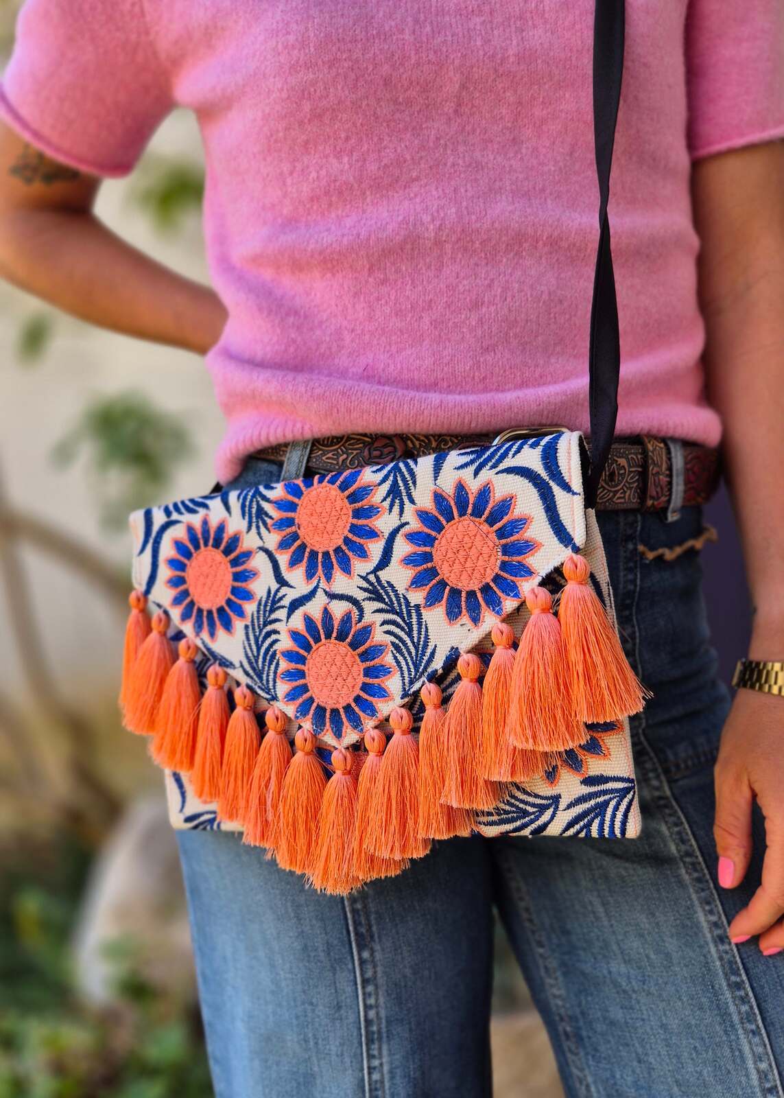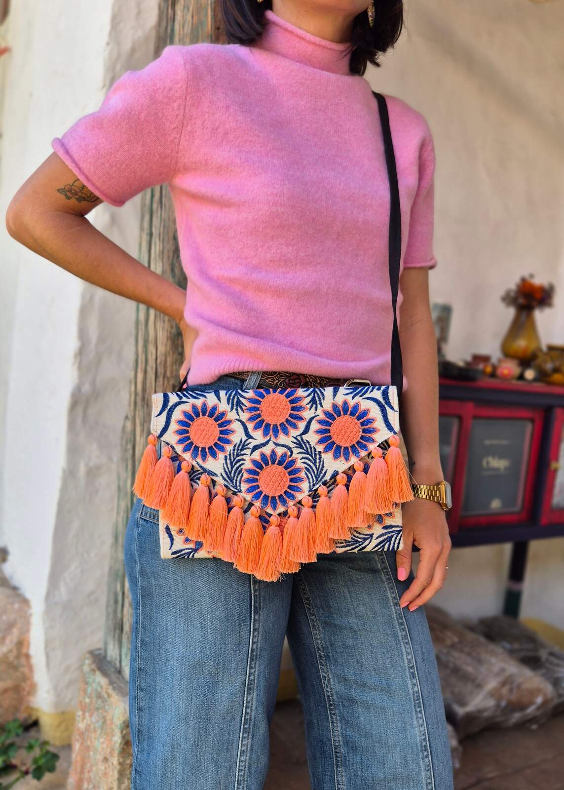 Haftowana kopertówka ze wzorami wykonana w Meksyku to unikalny i kolorowy dodatek, który odzwierciedla bogactwo kultury meksykańskiej. Torebka posiada haftowane wzory, które są charakterystyczne dla meksykańskiego rzemiosła ludowego. Kolorystyka kopertówki jest ciekawa i intensywna, często wykorzystuje bogatą paletę. Kopertówka ma praktyczny rozmiar, który pozwala na przechowywanie niezbędnych przedmiotów, takich jak telefon komórkowy, portfel czy klucze. Jest nie tylko funkcjonalna, ale także wyjątkowo piękna, stanowiąc niepowtarzalny element stroju i wyrażając meksykańską kreatywność i tradycję.