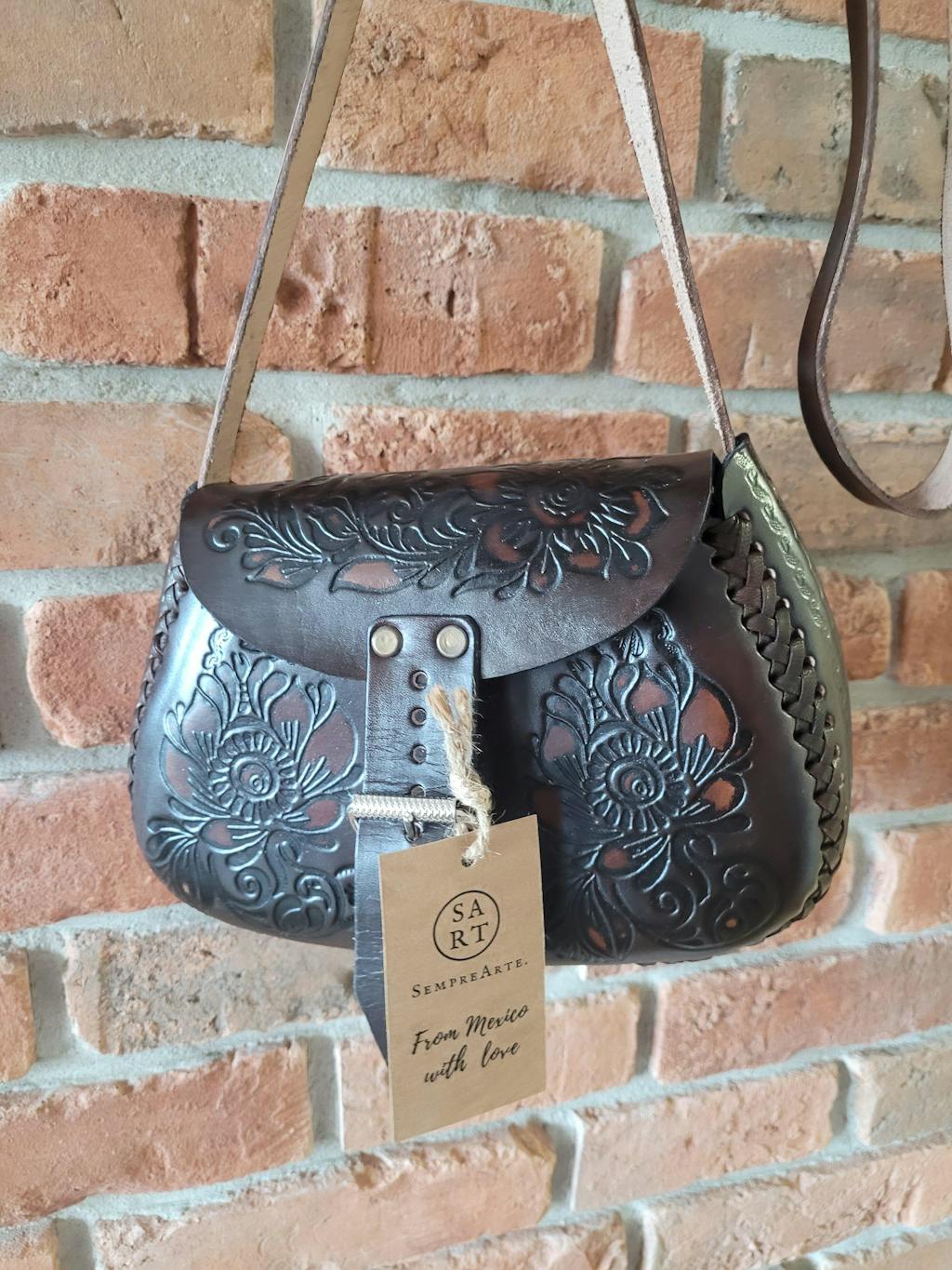 Skóra użyta to wykonania torebki skórzanej jest ręcznie garbowana, wzory wykonane są za pomocą odpowiedniego ręcznego stempla, a następnie malowane.