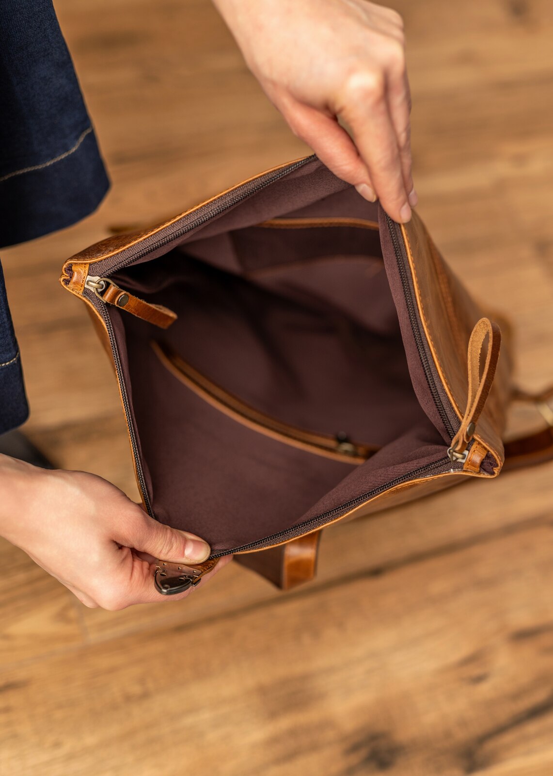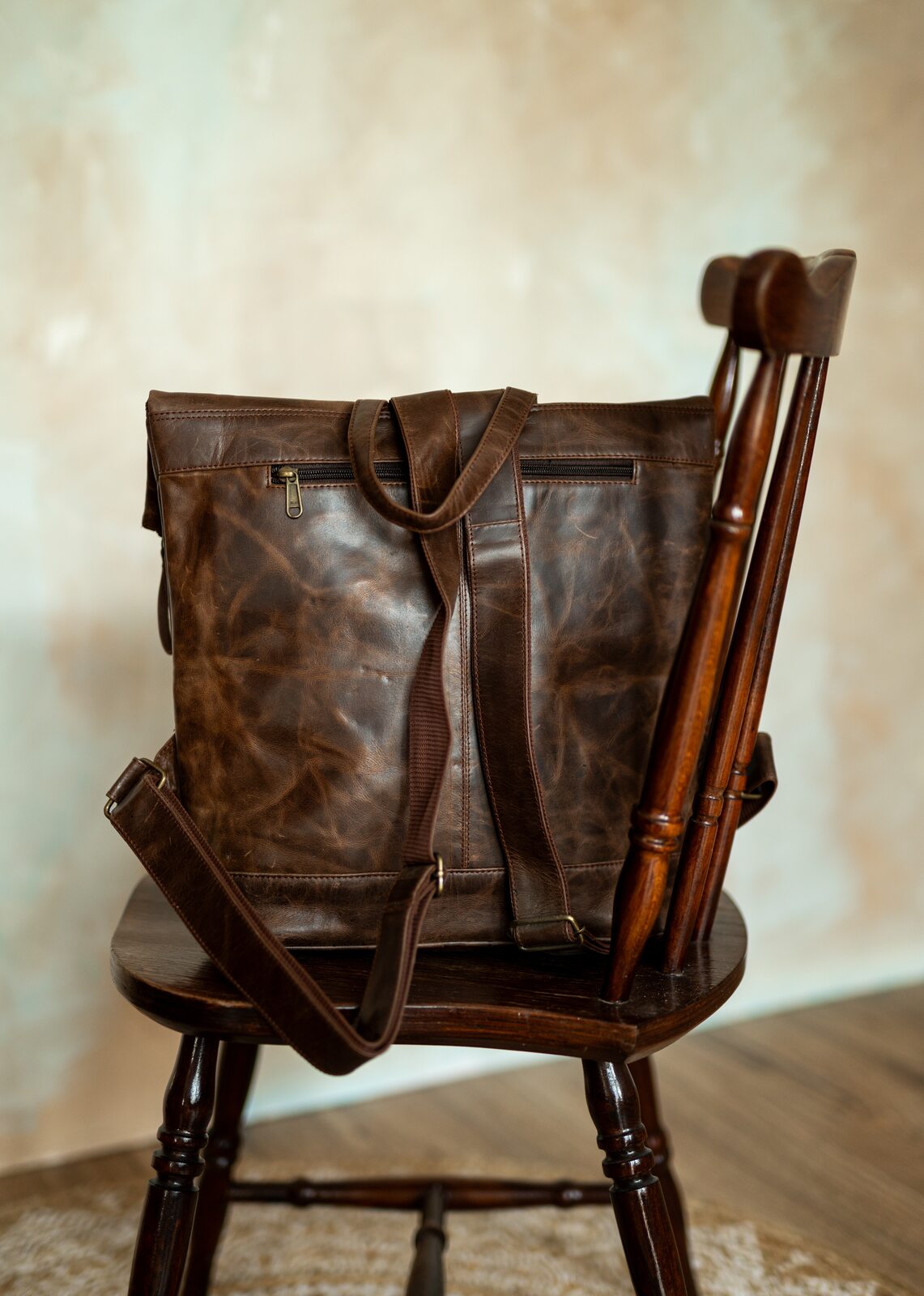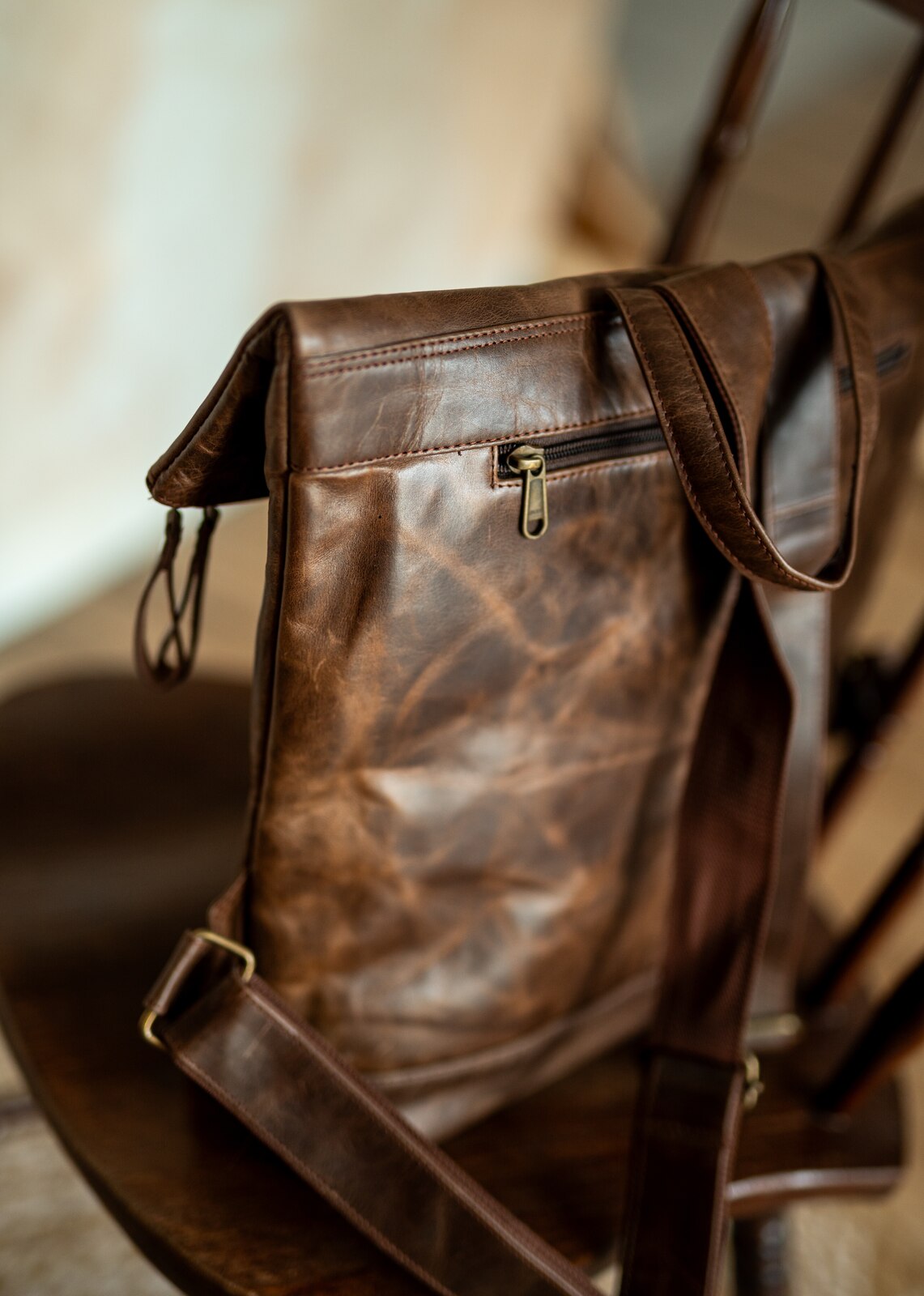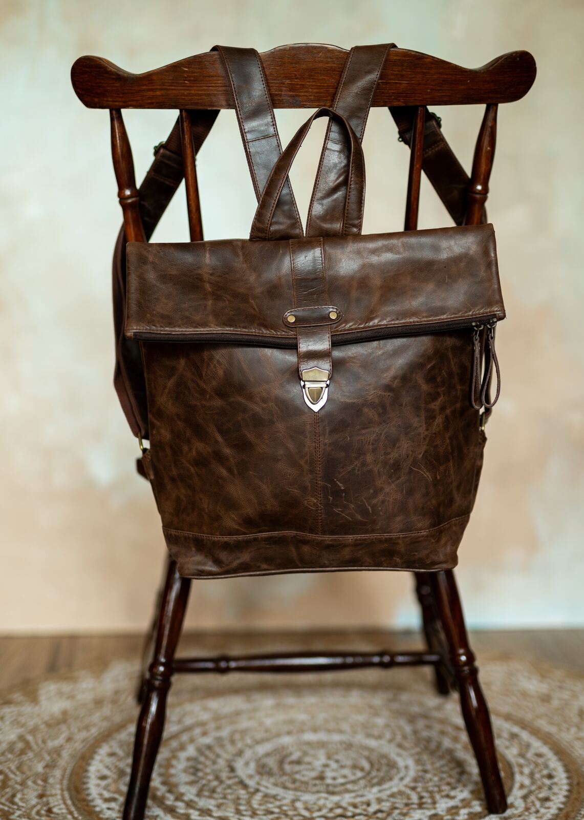 Ręcznie wykonany plecak ze skóry naturalnej, stworzony w Indiach. Plecak wykonany jest ze starannie wyselekcjonowanych materiałów, które gwarantują trwałość i naturalny charakter skóry. Konstrukcja plecaka jest zwijana, co nadaje mu minimalistyczny, ale funkcjonalny wygląd i możliwość regulacji objętości. Wykończenia są precyzyjne, a szwy mocne, co zapewnia długą żywotność nawet przy codziennym użytkowaniu. Naturalne odcienie skóry podkreślają autentyczność produktu i każdy egzemplarz ma unikalną fakturę skóry. Plecak łączy tradycyjne rzemiosło z praktycznością, idealny do miejskiego stylu życia oraz podróży. Dzięki kompaktowej formie, po złożeniu zajmuje niewiele miejsca, a po rozłożeniu zyskuje pełną pojemność na codzienne rzeczy.