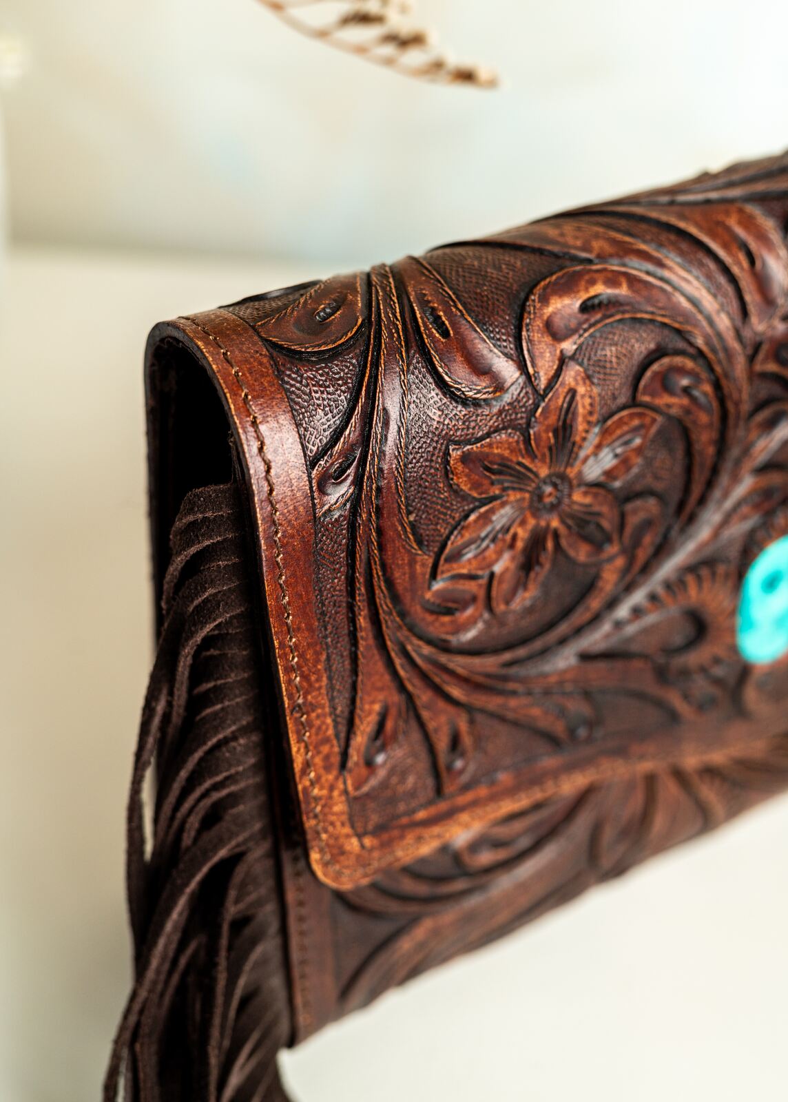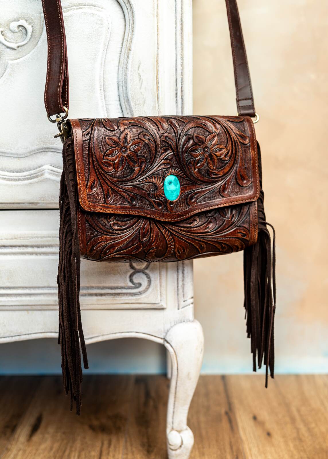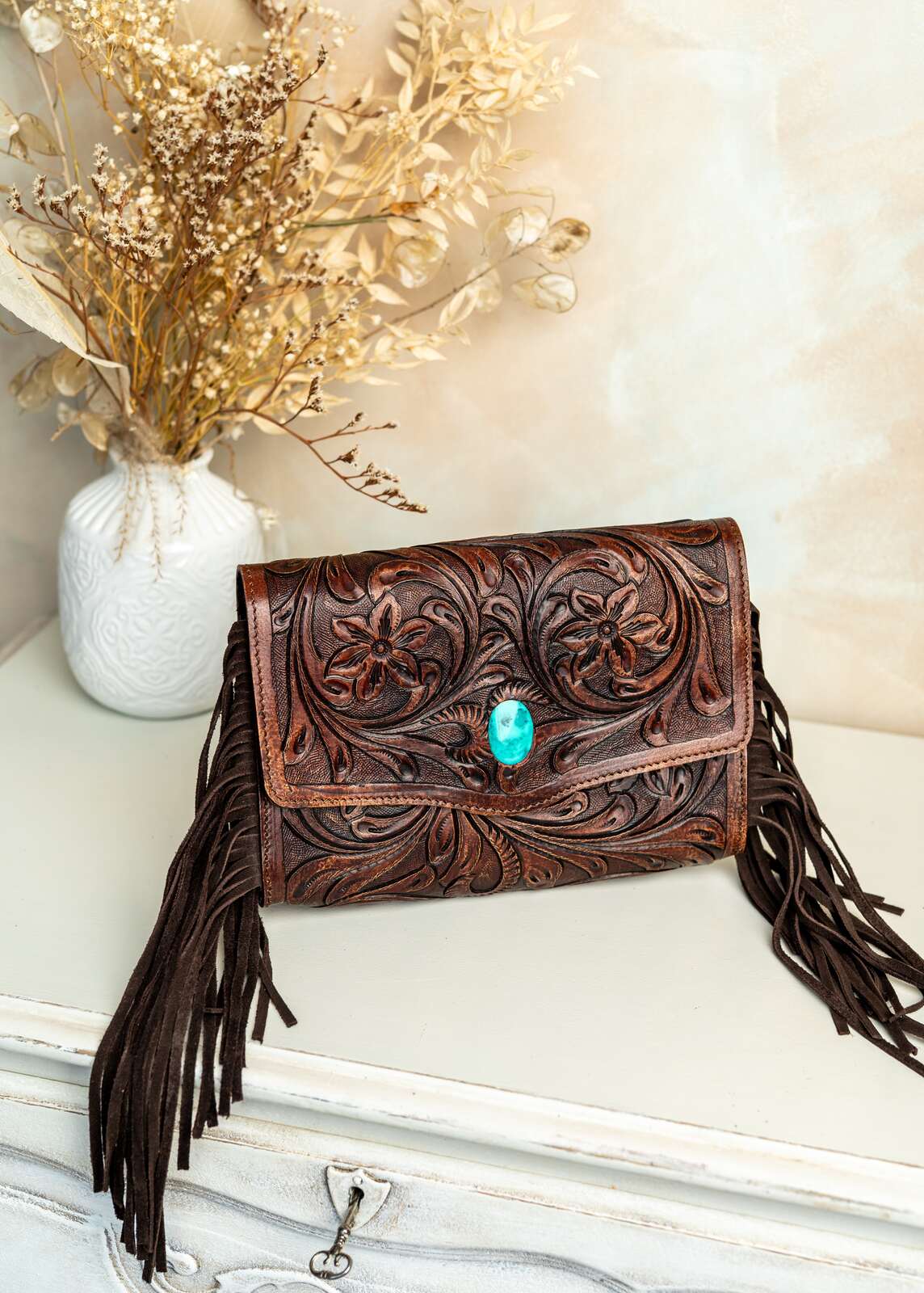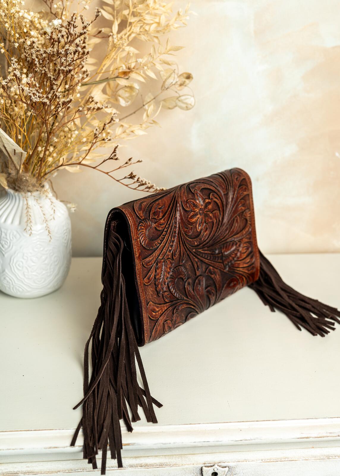 Ręcznie robiona torebka zdobiona z przodu i tyłu rzeźbieniem w skórze, które podkreśla unikatowy charakter każdego egzemplarza. Frędzle po bokach dodają naturalnego ruchu i lekko boho stylu, idealnie kontrastując z elegancką fakturą skóry. Wykonana z wysokiej jakości naturalnej skóry, która z czasem nabiera charakterystycznego patyny. Kompaktowy rozmiar mieści najpotrzebniejsze rzeczy, pozostawiając elegancki, minimalistyczny kształt. Solidne przeszycia gwarantują trwałość i codzienną odporność na użytkowanie. Zapięcie na bezpieczny zatrzask zapewnia wygodę użytkowania i pewność zawartości. Wykończona starannie, z dbałością o detale, ta torebka łączy klasykę rzeźbienia skórzanego z nowoczesnym, noszonym na co dzień stylem.