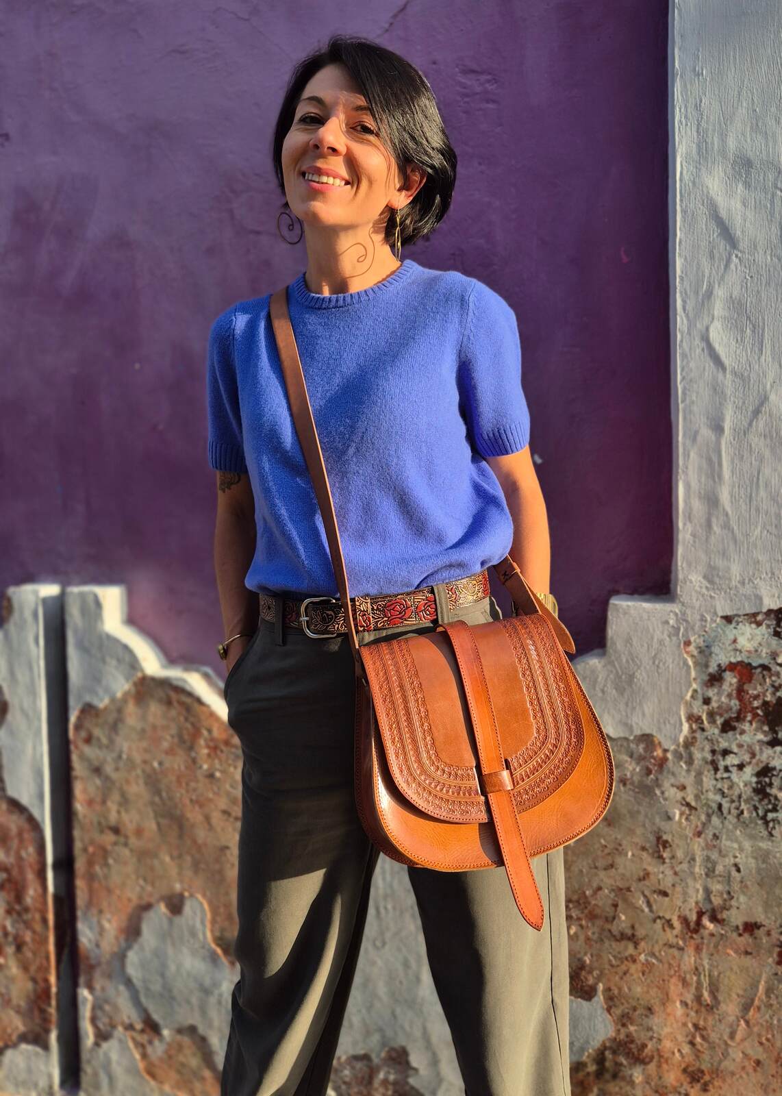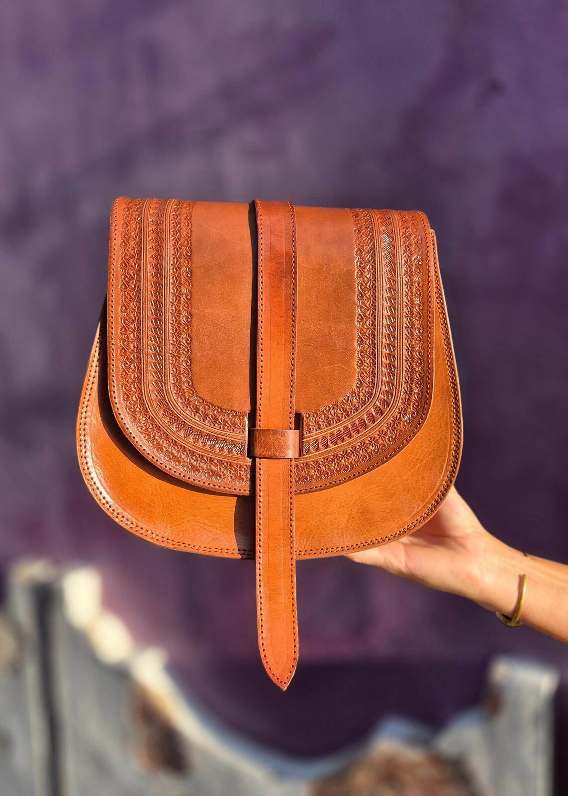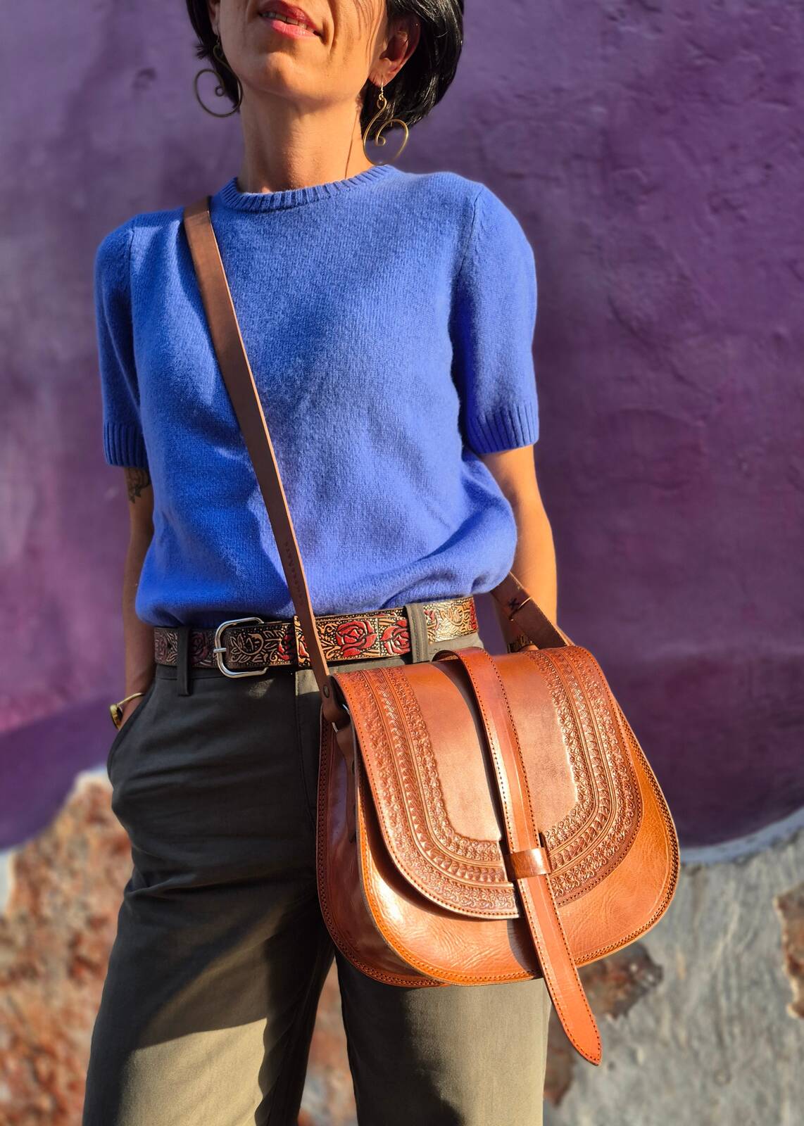 Ta duża torebka skórzana ręcznie wykonana w Meksyku jest prawdziwym majstersztykiem. Wykonana z gładkiej skóry juchtowej, oferuje trwałość i elegancję w jednym. Jej przestronny wnętrze zapewnia dużo miejsca na przechowywanie wszystkich niezbędnych przedmiotów. Ciekawe zapięcie torebki dodaje jej charakteru i oryginalności, stanowiąc zarazem praktyczny element. Skóra juchtowa jest nie tylko wytrzymała, ale również pięknie się starzeje, nabierając naturalnej patyny z czasem. Torebka skórzana posiada wygodny, regulowany pasek, który umożliwia noszenie jej na ramieniu lub na skos. Jej klasyczny design pasuje zarówno do casualowych, jak i bardziej formalnych stylizacji. Jest nie tylko praktyczna, ale także piękna i unikalna, przyciągając uwagę wszystkich miłośników rzemieślnictwa i pięknych przedmiotów.