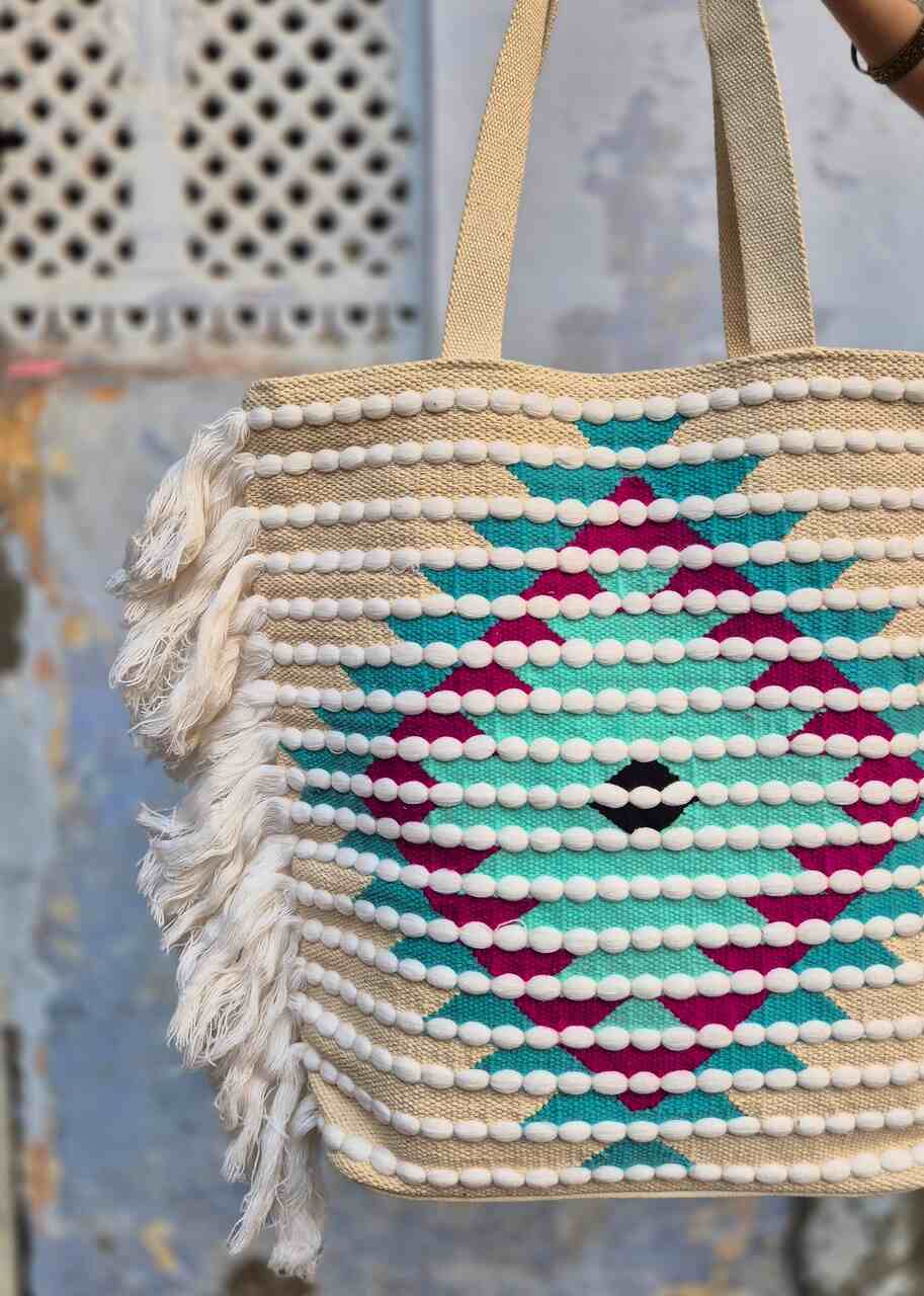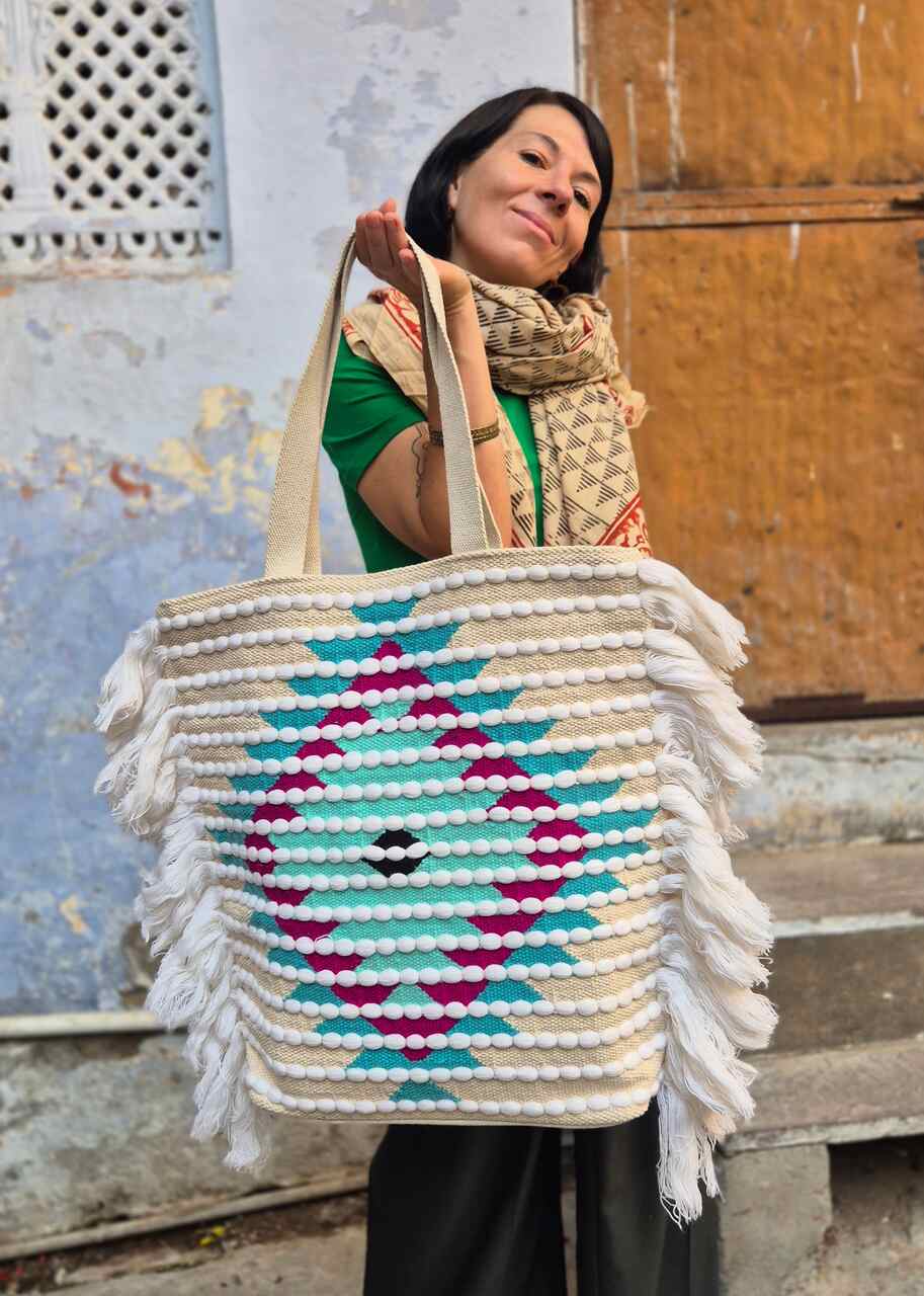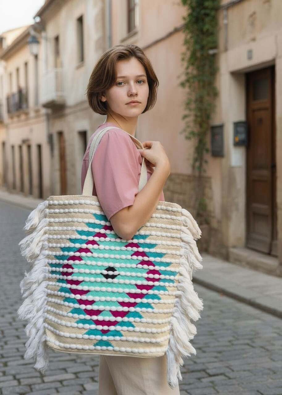 Duża i pojemna torba, idealna na zakupy, codzienne wyjścia i podróże, wykonana z trwałego materiału, który utrzymuje kształt i chroni zawartość, z delikatnym wzorem na froncie. Frędzle po bokach dodają ruchu i lekkiego uroku, długie, wygodne rączki umożliwiają noszenie na ramieniu lub w dłoni, wnętrze wykończone praktycznymi przegródkami i kieszeniami na drobiazgi, a połącznie beżu z kolorowym wzorem sprawia, że torba pasuje do wielu stylizacji i okazji.