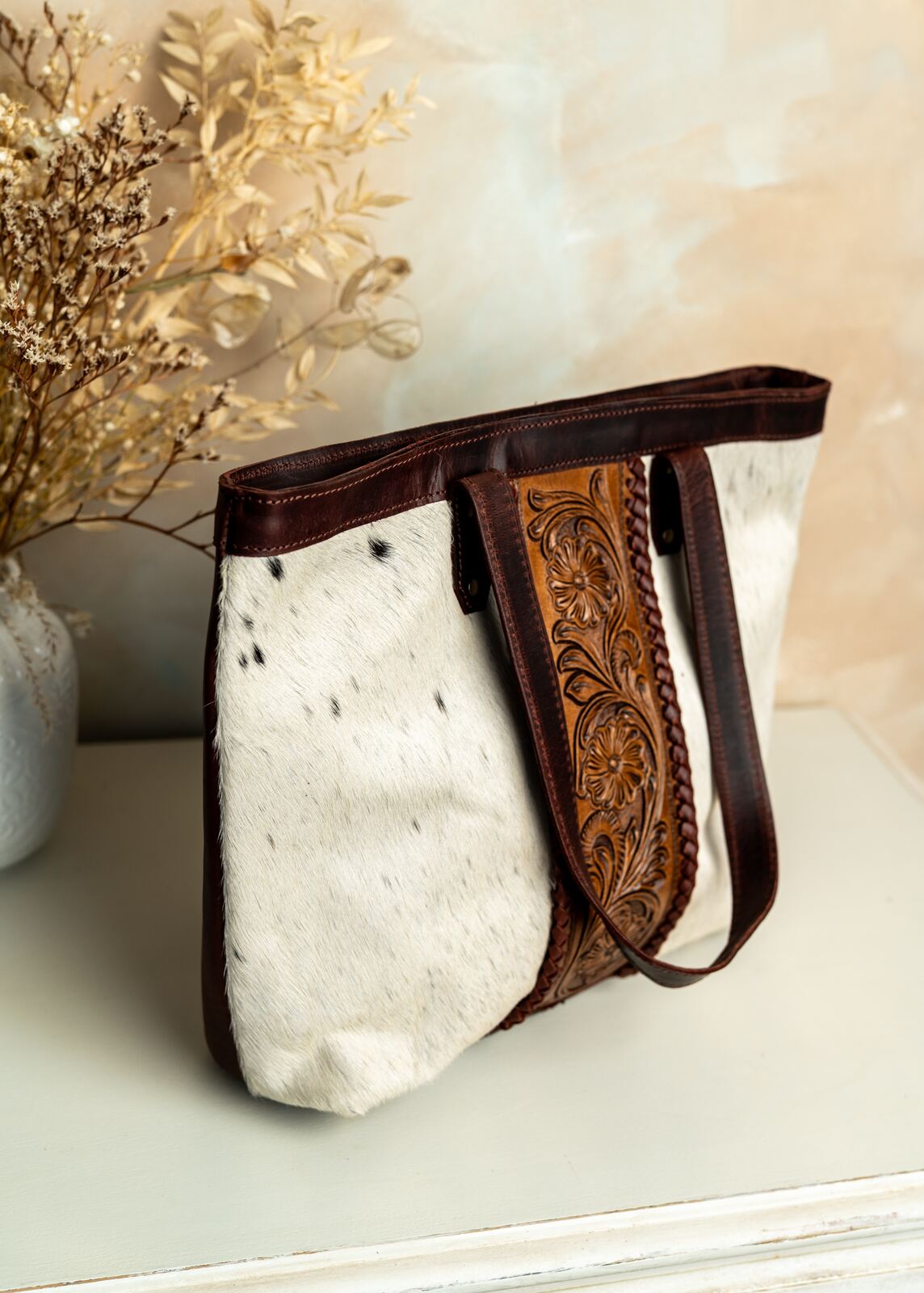 Duża i pojemna torebka wykonana ze skóry z naturalnym włosiem prezentuje eleganckie, luksusowe wykończenie. Zdobiona jest misternym rzeźbieniem w skórze, które nadaje jej unikalny charakter i wyrafinowaną fakturę. Dzięki solidnej konstrukcji i wysokiej jakości materiałów, torebka łączy trwałość z wyraźnym stylem. Naturalne włosie dodaje jej mistycznego uroku i subtelnego połysku, który przyciąga spojrzenia. Smukłe, starannie wykończone detale podkreślają precyzję wykonania. Wnętrze zaprojektowano z myślą o funkcjonalności, mieszczące najważniejsze akcesoria w organizowanych kieszeniach. Całość tworzy ponadczasowy dodatek, idealny do codziennych stylizacji oraz bardziej formalnych looków.