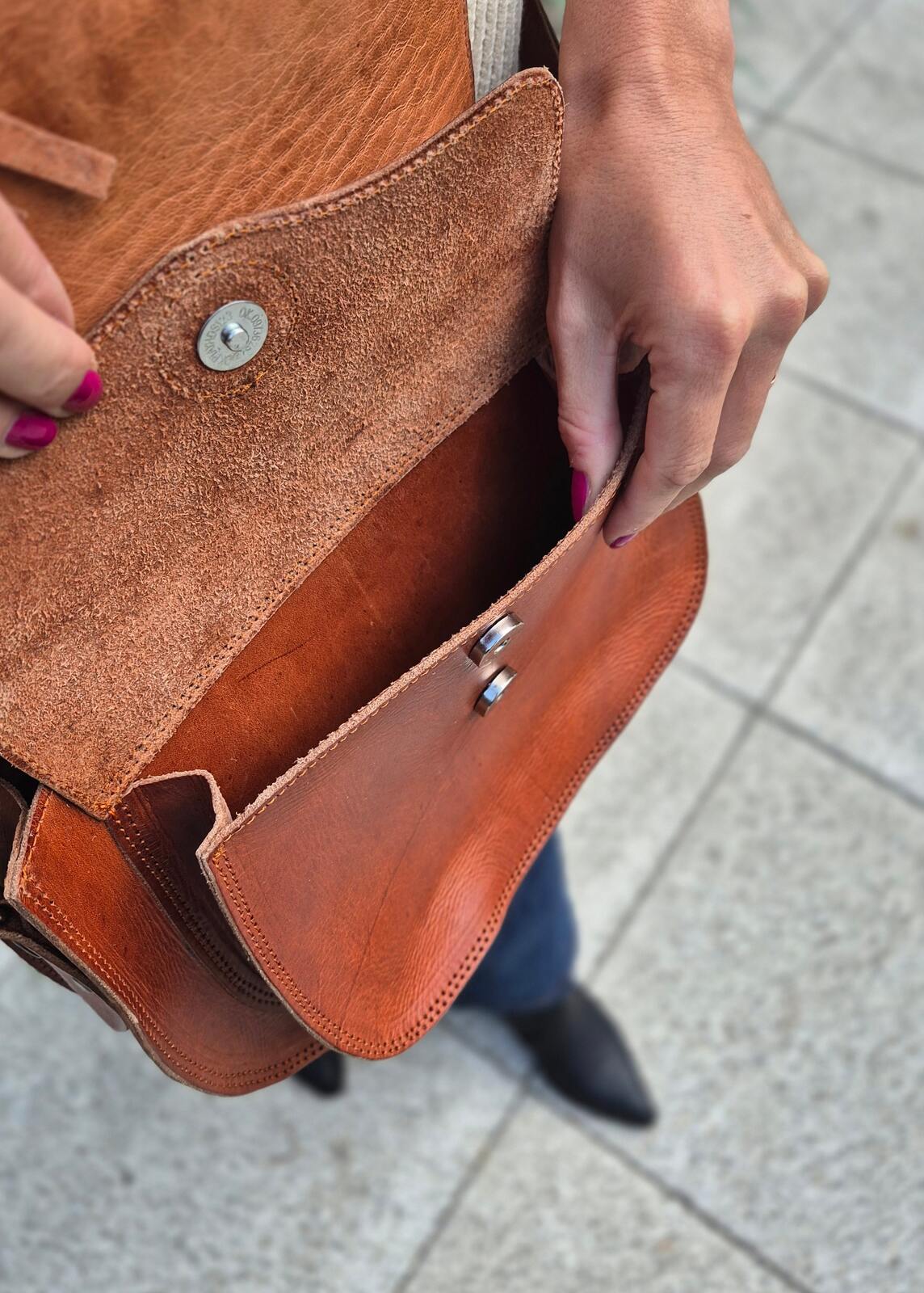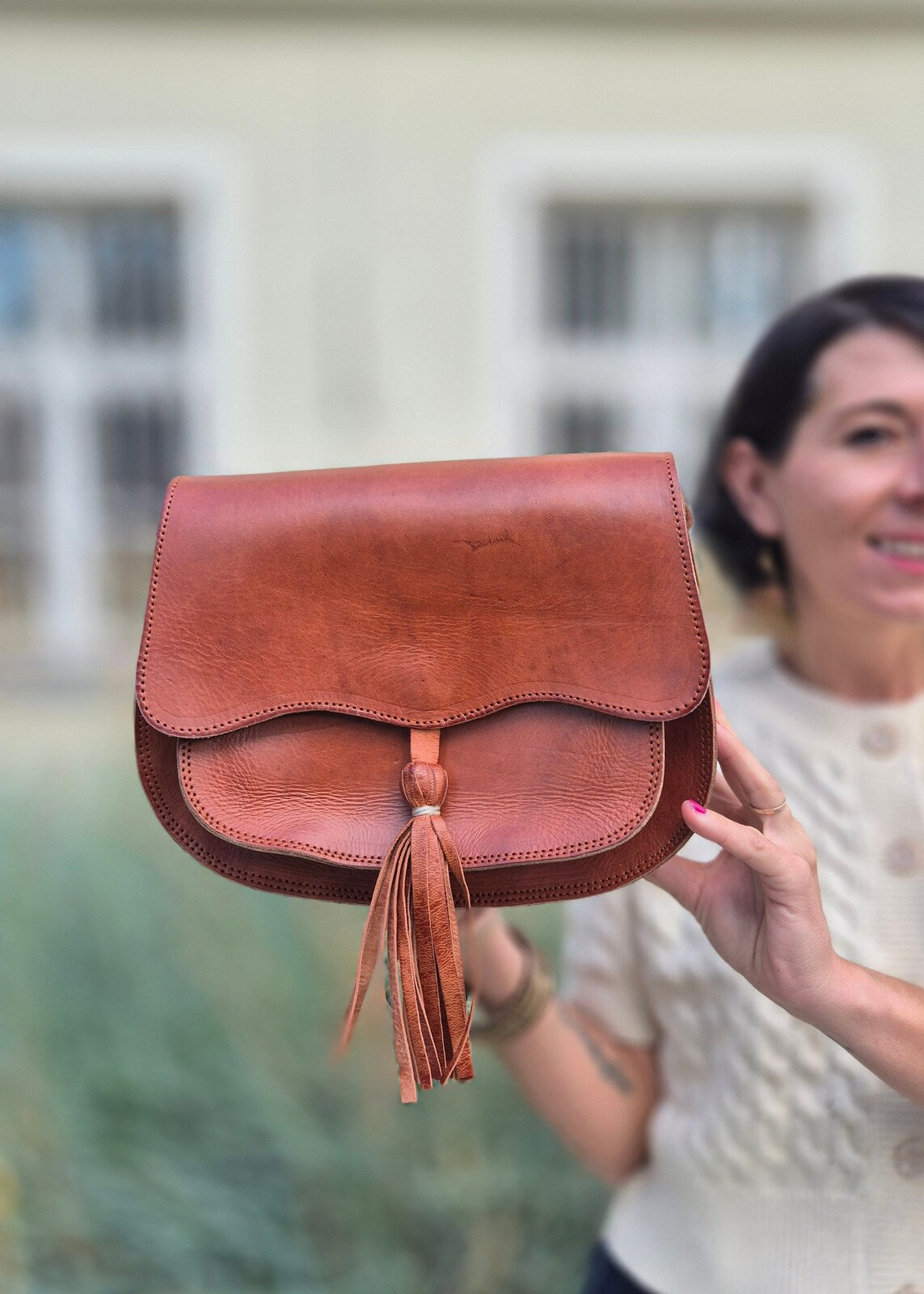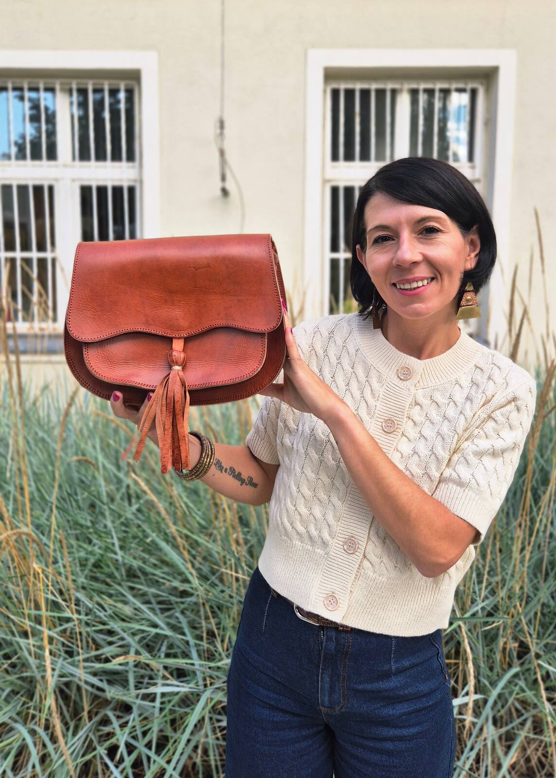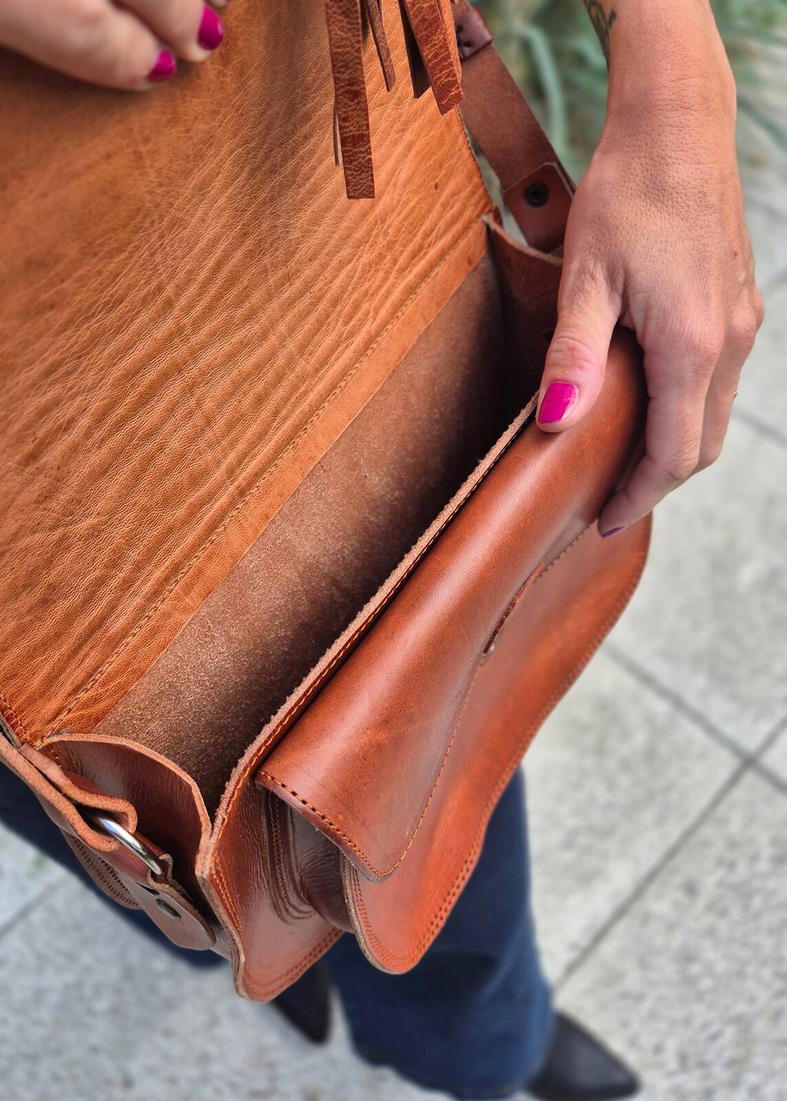 Duża torebka ręcznie wykonana w Meksyku jest prawdziwym majstersztykiem. Wykonana z gładkiej skóry juchtowej, oferuje trwałość i elegancję w jednym. Jej przestronny wnętrze zapewnia dużo miejsca na przechowywanie wszystkich niezbędnych przedmiotów. Ciekawe zapięcie torebki dodaje jej charakteru i oryginalności, stanowiąc zarazem praktyczny element. Skóra juchtowa jest nie tylko wytrzymała, ale również pięknie się starzeje, nabierając naturalnej patyny z czasem. Torebka posiada wygodny, regulowany pasek, który umożliwia noszenie jej na ramieniu lub na skos. Jej klasyczny design pasuje zarówno do casualowych, jak i bardziej formalnych stylizacji. Jest nie tylko praktyczna, ale także piękna i unikalna, przyciągając uwagę wszystkich miłośników rzemieślnictwa i pięknych przedmiotów.