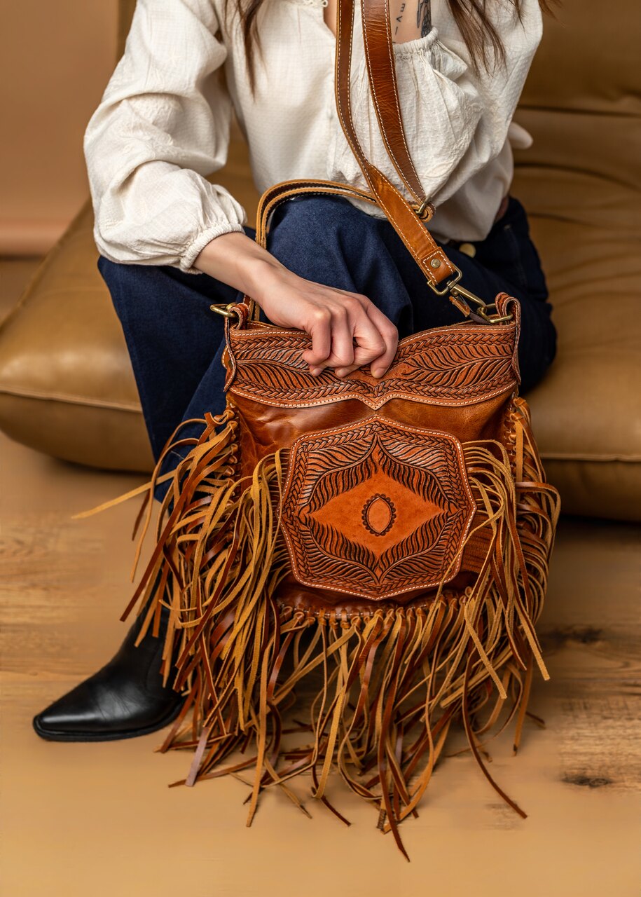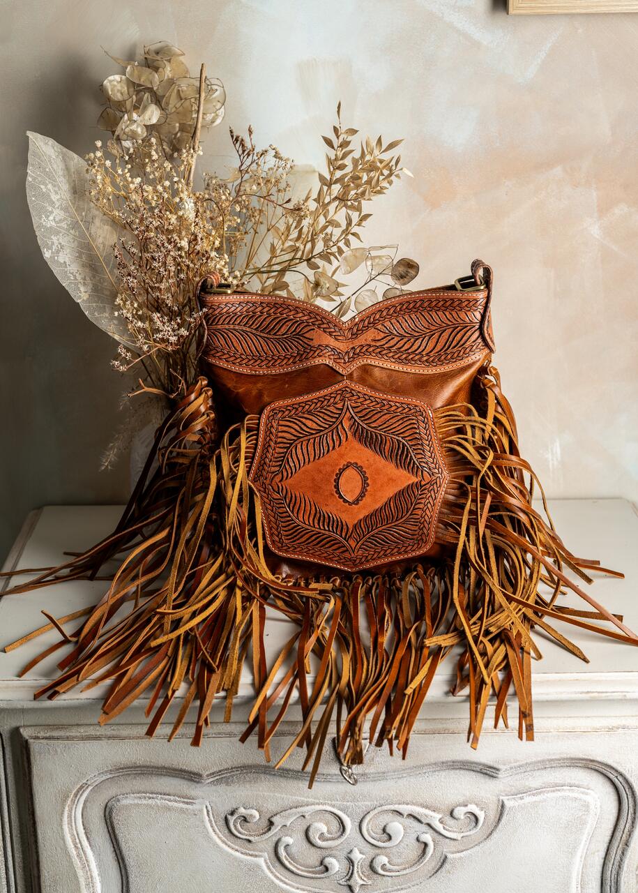 Duża torba typu shopper z ciekawym zdobieniem na skórze, cała wykonana ze skóry z dodatkiem frędzli po bokach. Wytrzymałe szycie i solidny pasek zapewniają wygodny chwyt nawet przy dużym wypełnieniu. Frędzle po bokach dodają lekko boho charakteru i ruchomego, dynamicznego wyglądu. Zdobienie skóry podkreśla naturalne słoje i głębię koloru, nadając torbie niepowtarzalny efekt. Wnętrze wyposażone w praktyczną kieszeń, które pomaga uporządkować drobiazgi. Idealna dla osób ceniących stylowe, trwałe dodatki o wyjątkowym, boho charakterze.