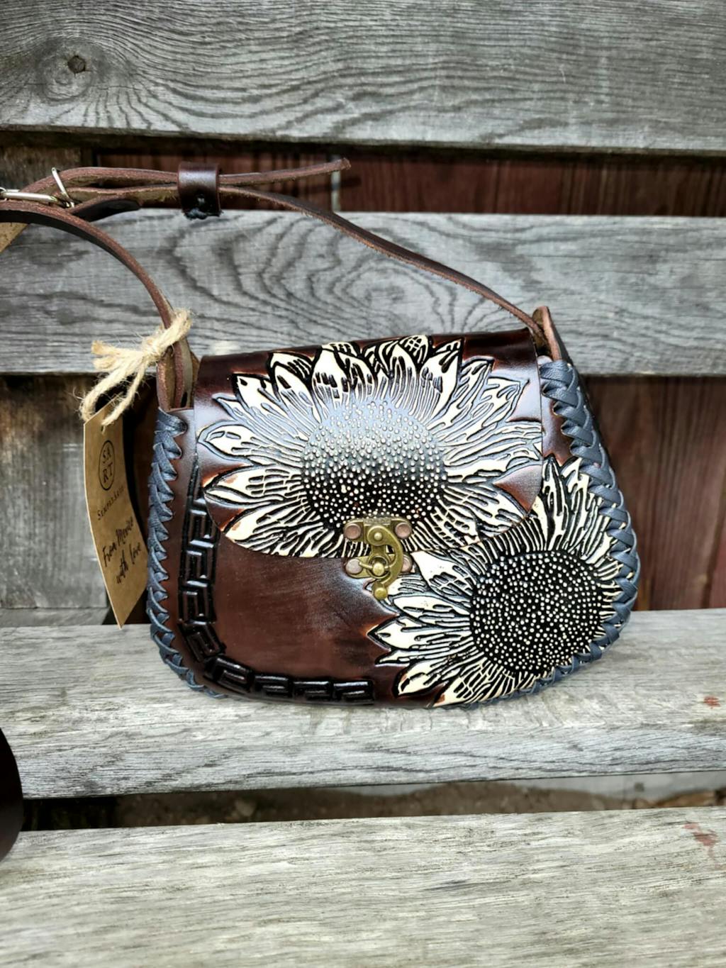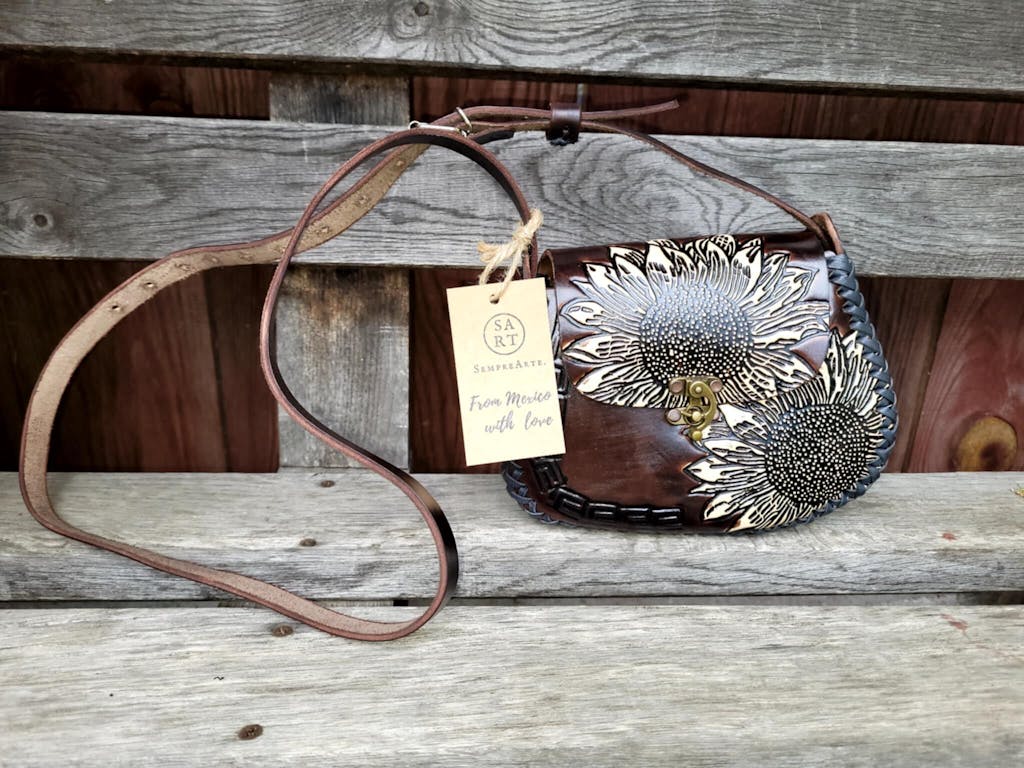This leather handbag is handcrafted in Mexico from thick, genuine leather. Its unique design is adorned with sunflower motifs, giving it a distinctive style and character. Every detail of the bag has been meticulously crafted by experienced artisans, making it not only a beautiful but also a durable addition to your wardrobe. The use of genuine leather ensures that the bag will last for many years, retaining its unique appearance. Its intriguing design makes it a perfect addition to both everyday outfits and special occasions. This leather handbag is not only a practical wardrobe item but also a testament to the artistic skill of Mexican artisans, who pour their passion and traditions into its creation.