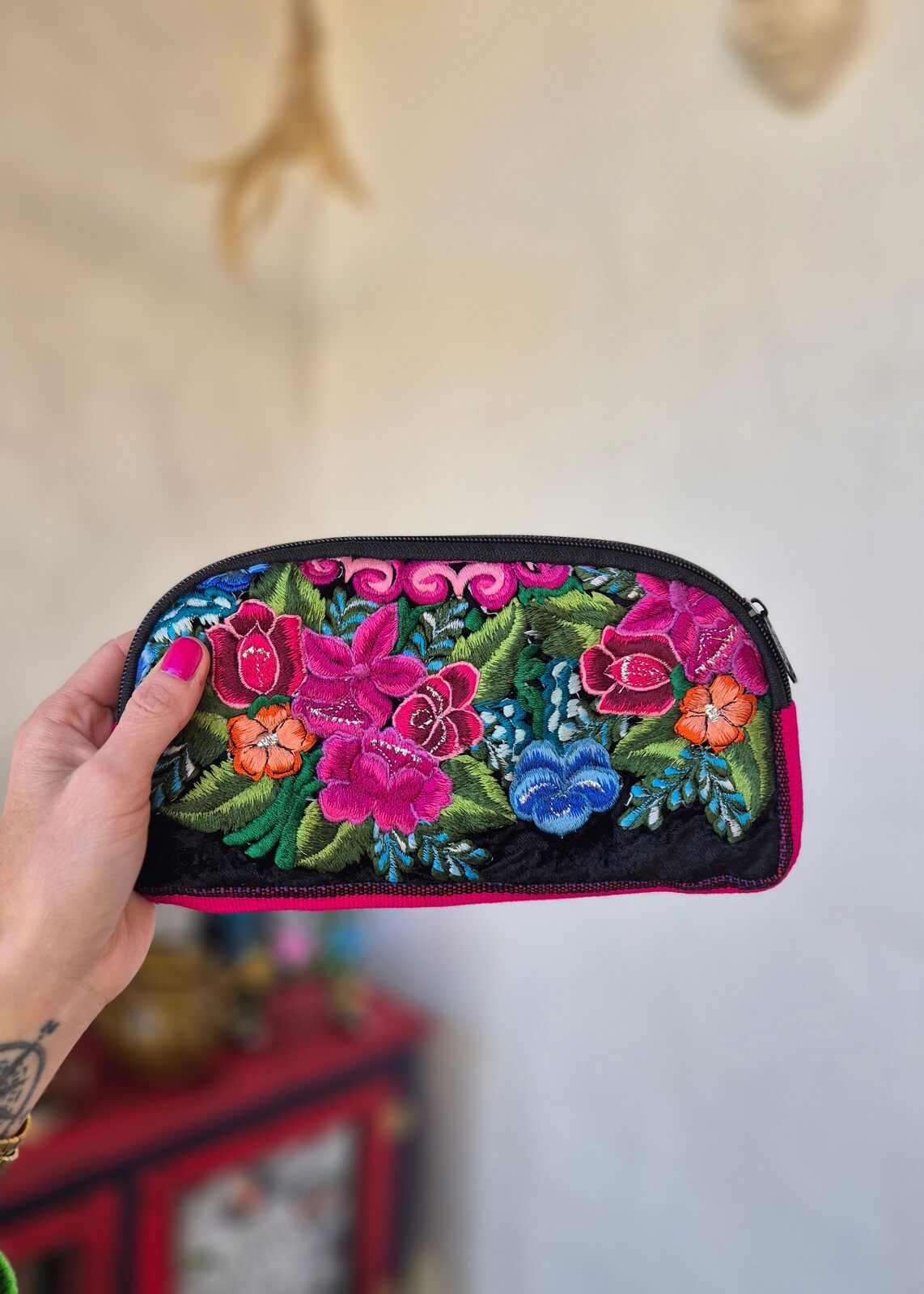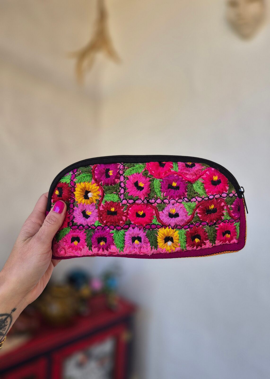 El estuche bordado Flores es una pieza verdaderamente única que podrá servirte todos los días. Cada detalle de este estuche está elaborado cuidadosamente por mujeres que han estado bordando durante generaciones. El frente del estuche presenta hermosas flores bordadas con hilos de diferentes colores, reflejando la rica cultura de Chiapas. Este estuche único no solo es un artículo práctico, sino también una hermosa decoración que agrega elegancia y encanto al uso diario.
